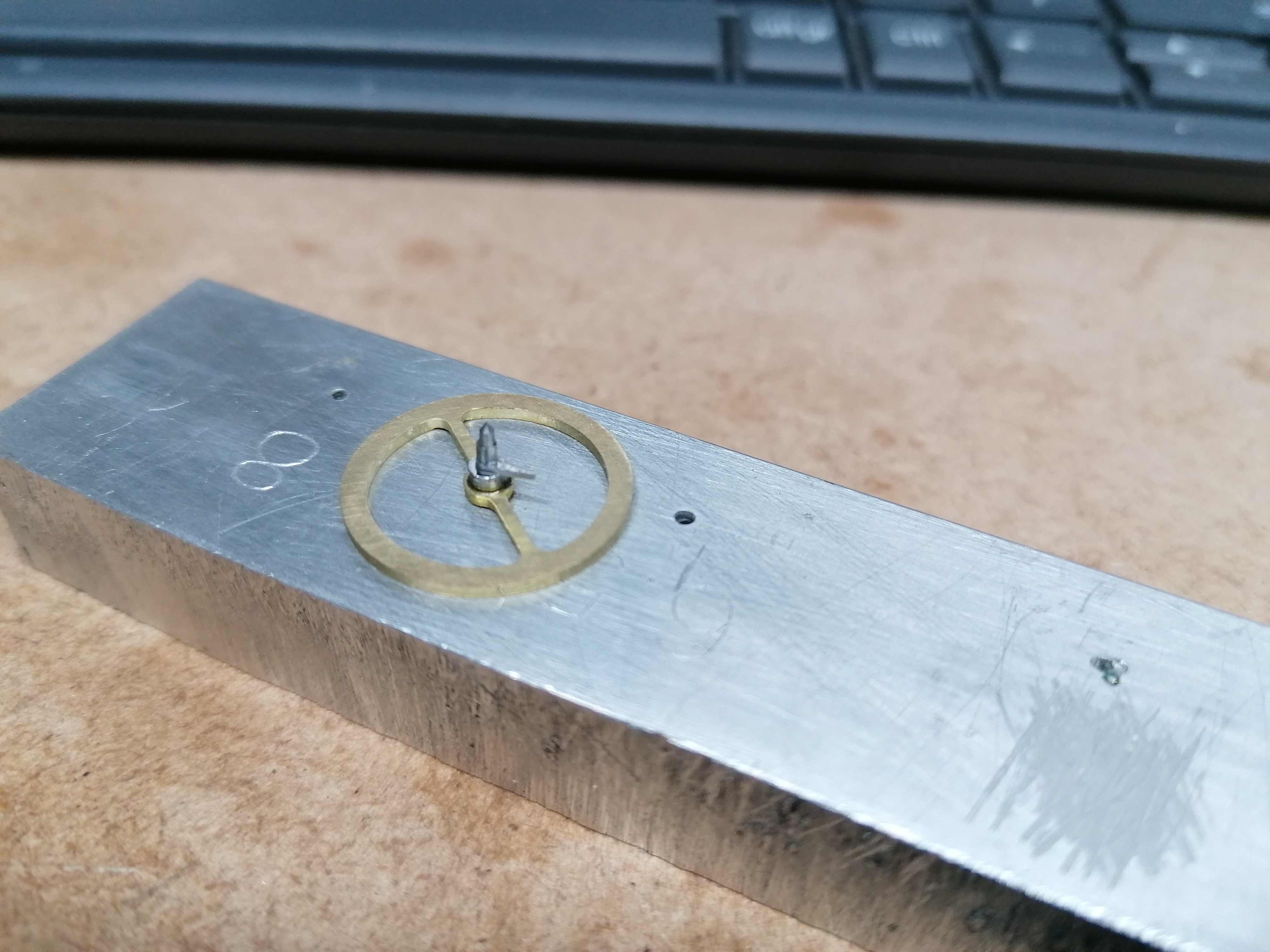 I've drilled a hole for the hairspring, and fitted it with a tapered pin: