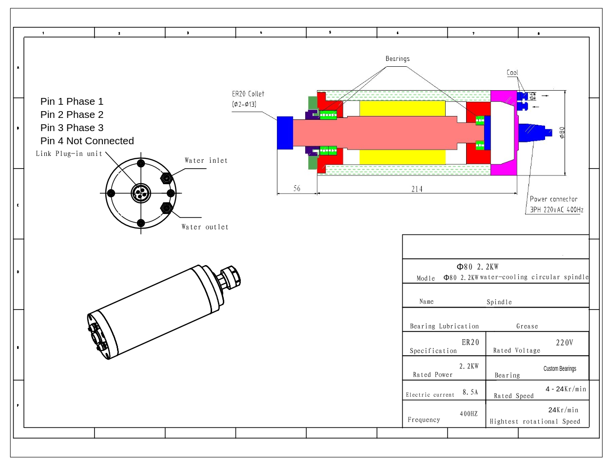 I found this drawing on https://www.cnc4you.co.uk/Spindle/Water-Cooled/Spindle-Motor-Single-phase-to-3-Phase-2.2KW-Water-cooled-ER20-with-Matching-VFD - might have been helpful: