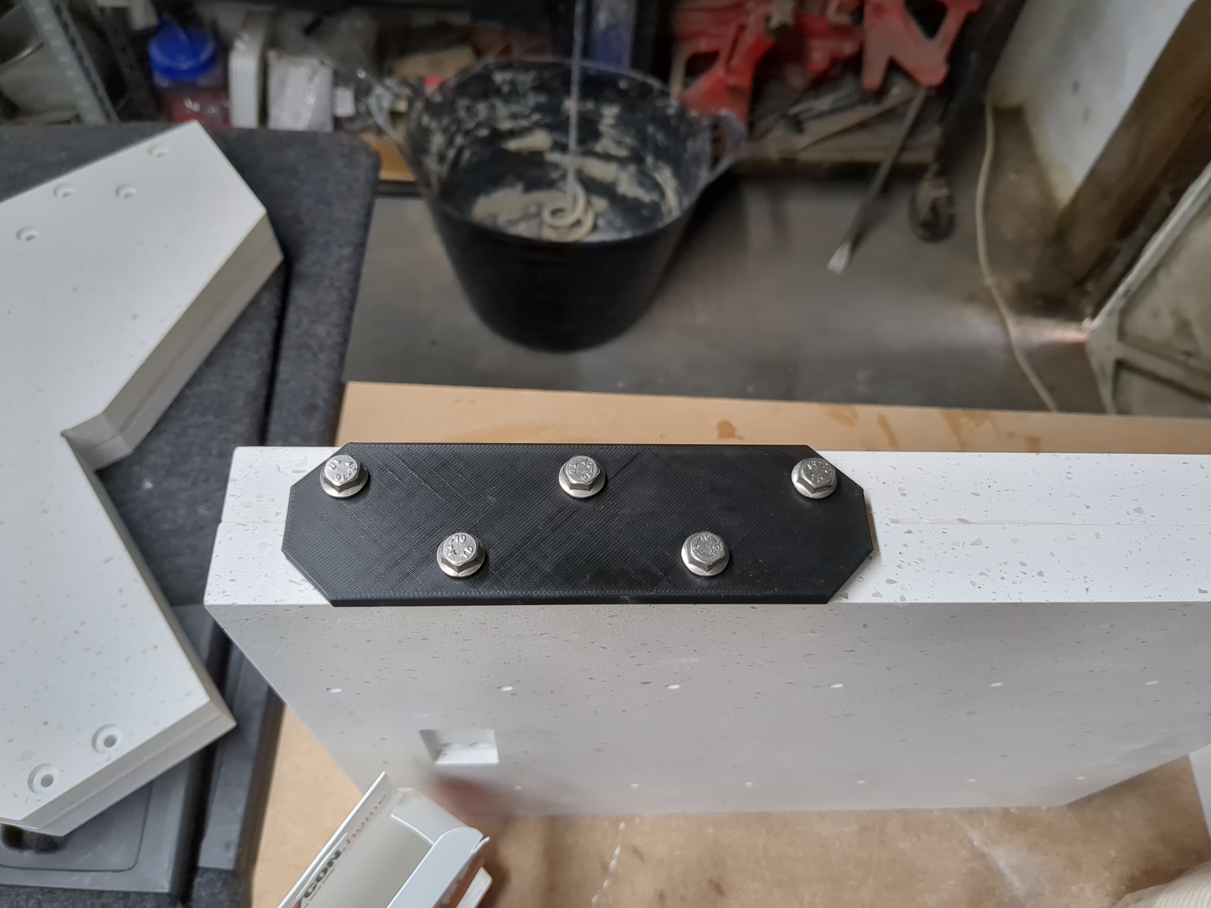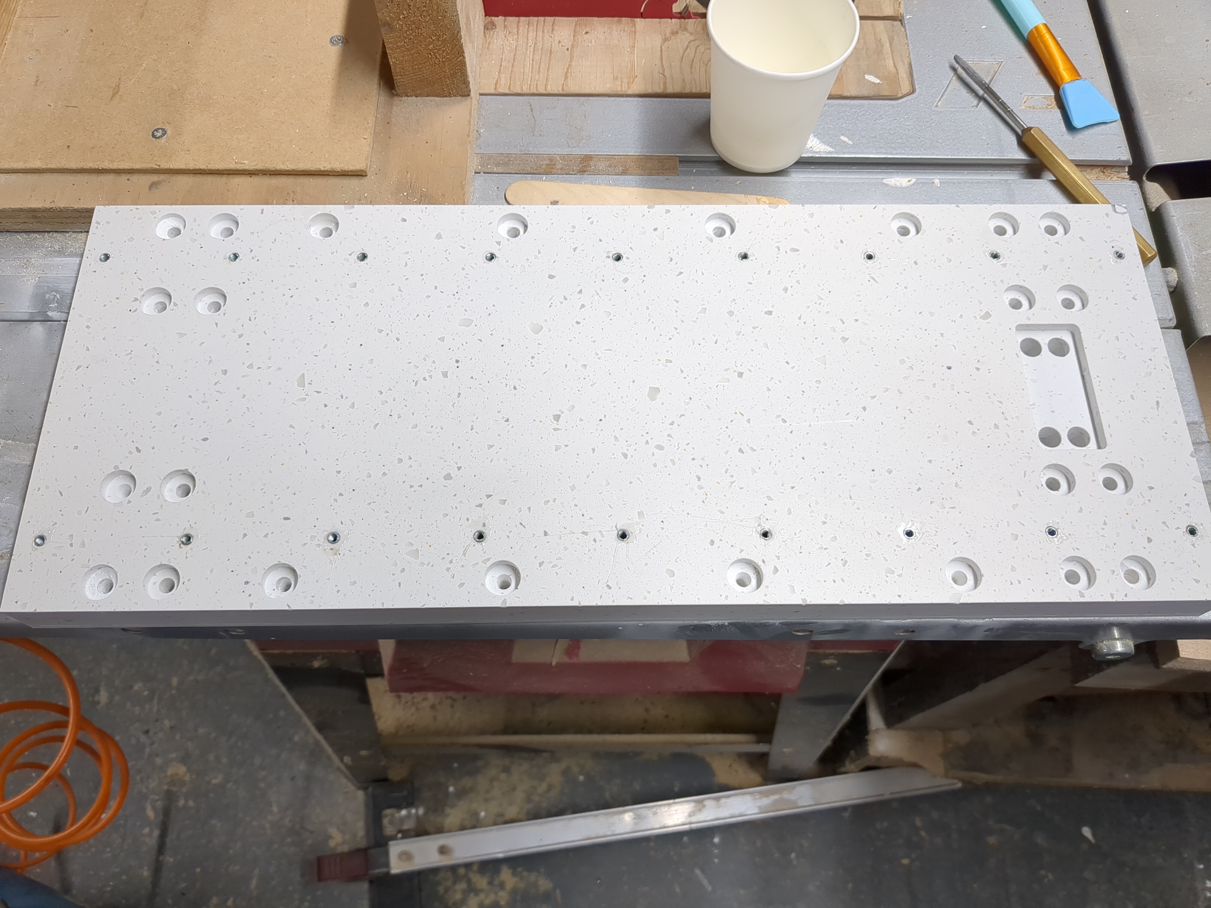 I had it sitting flat on the bench at first, and the inserts kept sinking into the holes, so I put some flanged bolts in them to pull them up to the surface, but it looks like the bolts may end up glued into the inserts. I definitely need to try and loosen these before the glue sets. It's now 11am, so I'll probably try and take them out just after I take the template off the other part.