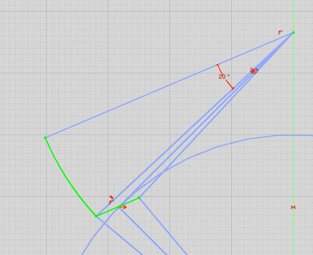 Now we need to draw an arc at the left-hand edge of this pallet face, centered on the anchor pivot, and that's our frictional rest pallet. It needs to be long enough that at maximum amplitude the escape wheel doesn't fall off it. Let's say maximum amplitude is 20 degrees, make this arc join up with a line 20 degrees away from the tangent line: