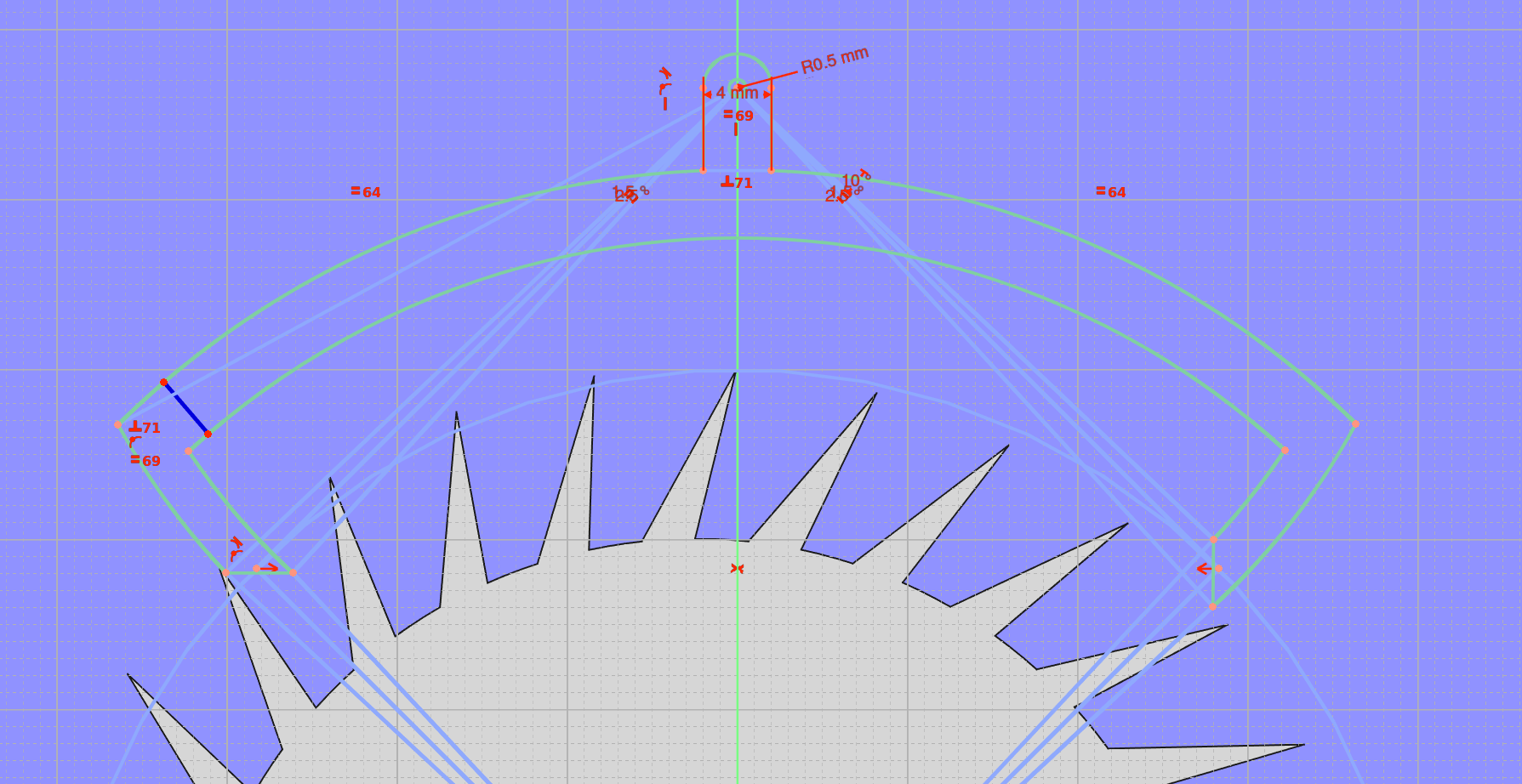 Oh! By making the impulse face span 10 degrees, with 2 degrees drop, I am basically saying that when a tooth escapes a pallet, I want there to be already another tooth dropping onto the same pallet. That is not right, I want the next tooth to drop onto the other pallet. So instead of saying I have 12 degrees between teeth, I think I actually say I have only 6 degrees between teeth, because they drop onto the pallets alternately. So the impulse face should span only 4 degrees.