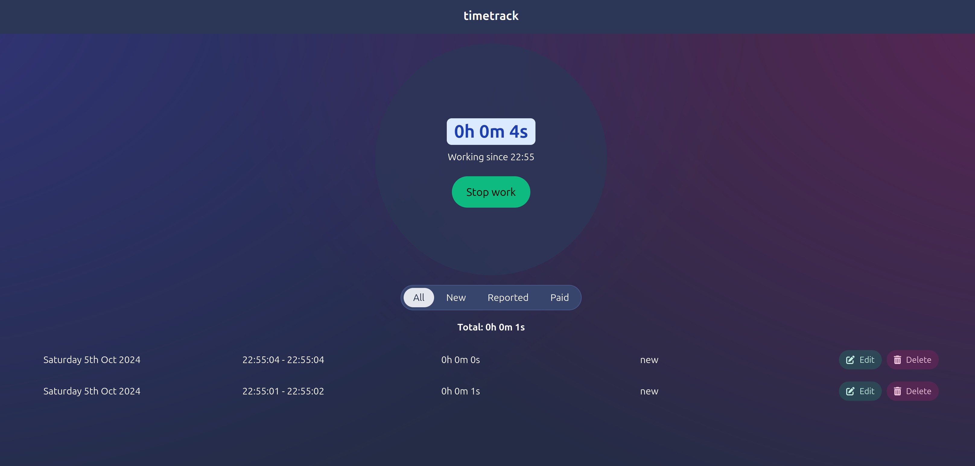 Let's make a time tracker app using svelte and skeleton. The backend will be written in Go, but don't worry about it for now, just imagine the backend exists, you can define the API if you want. The site will be served as a static site. I want to have a button to start/stop work, I want the page to very clearly show whether I'm currently working and how long the current stint has been active, as well as how long I've worked in total. When I stop a stint add it to the list of previous stints. Previous stints should be editable in case I forget to start/stop at the right time. Also the current stint's start time should be editable while it's still active. I should be able to add/delete previous stints. And make it look really cool and modern.