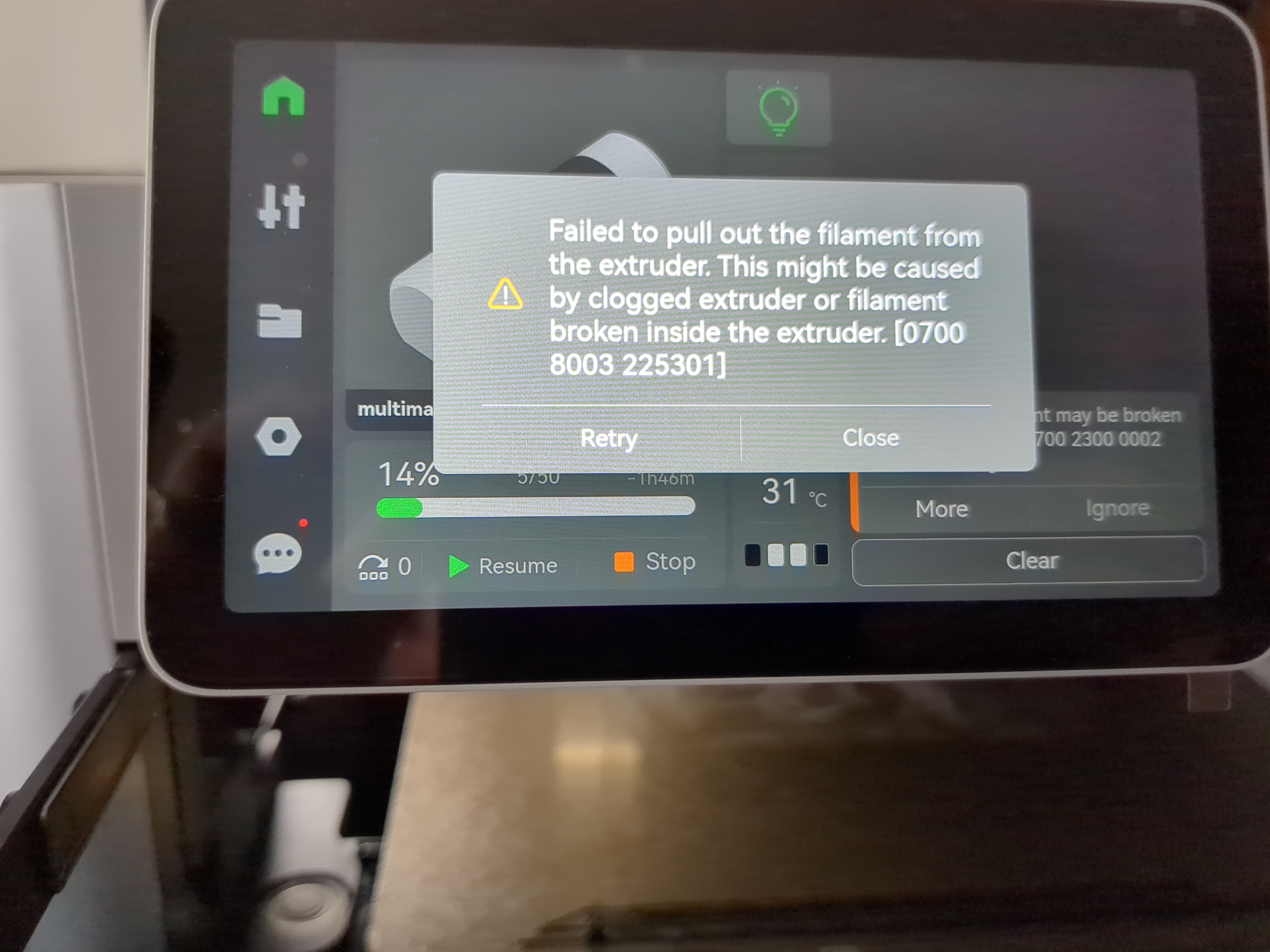 Failed to pull out the filament from the extruder. This might be caused by clogged extruder or filament broken inside the extruder. [0700 8003 225301]