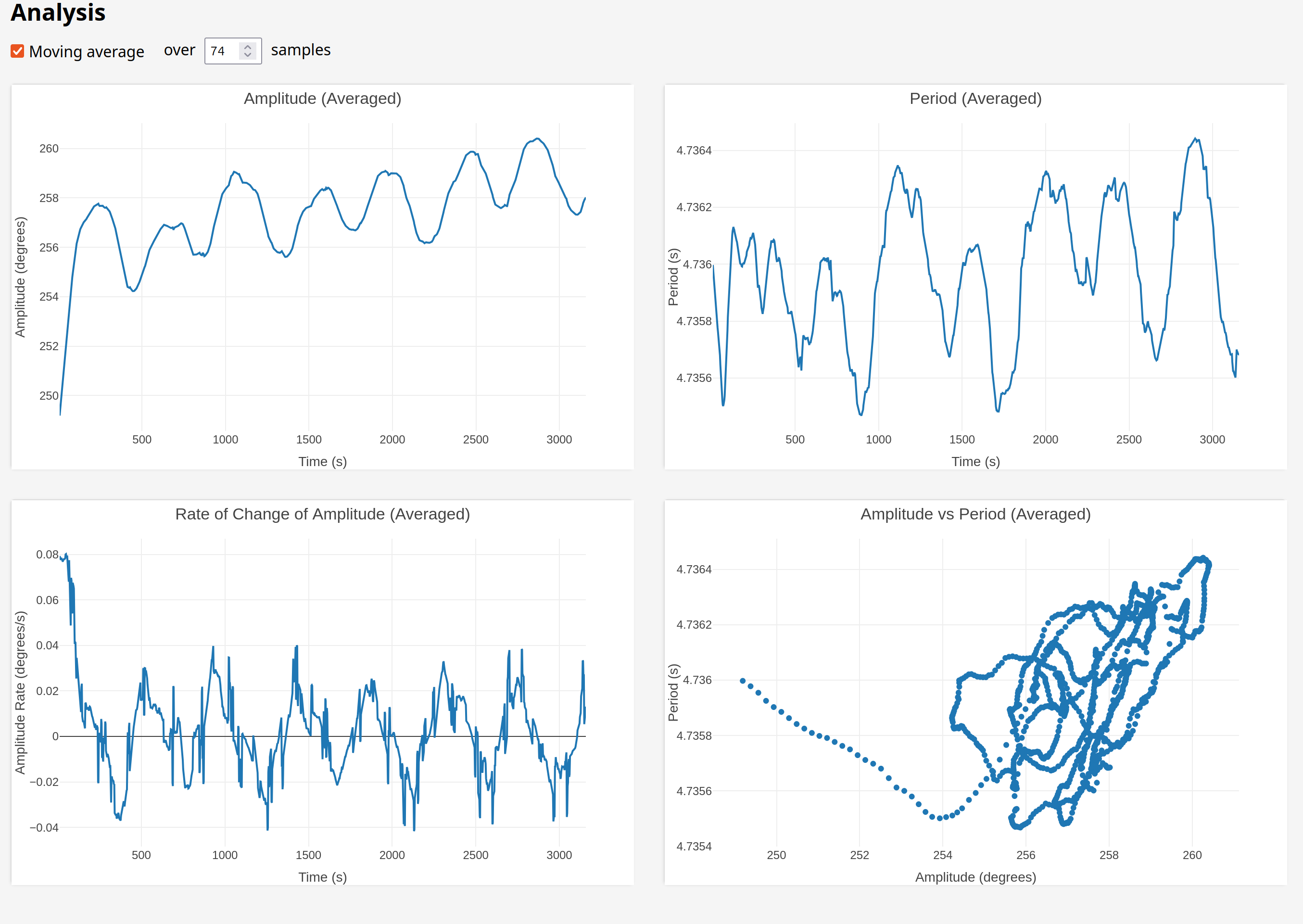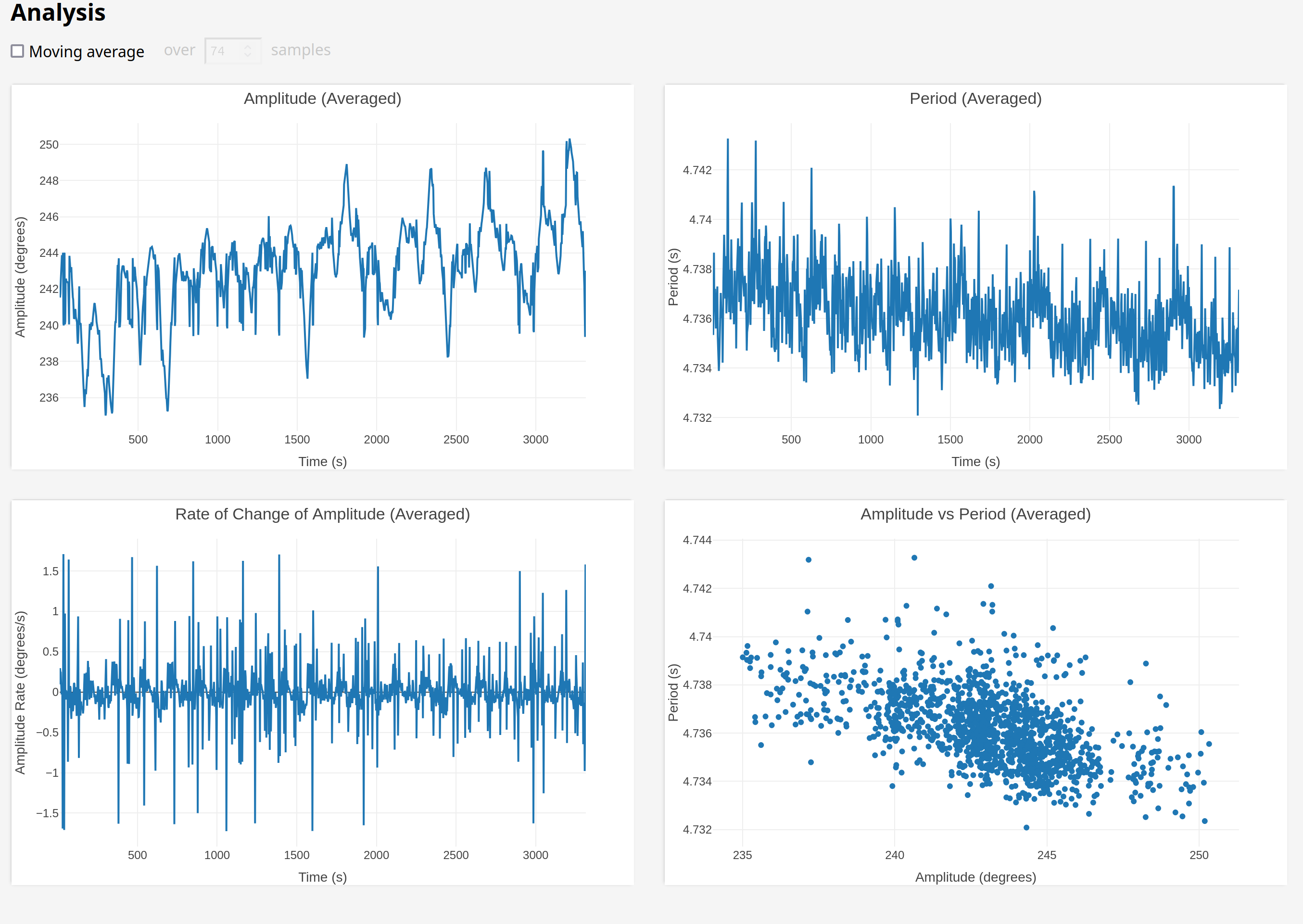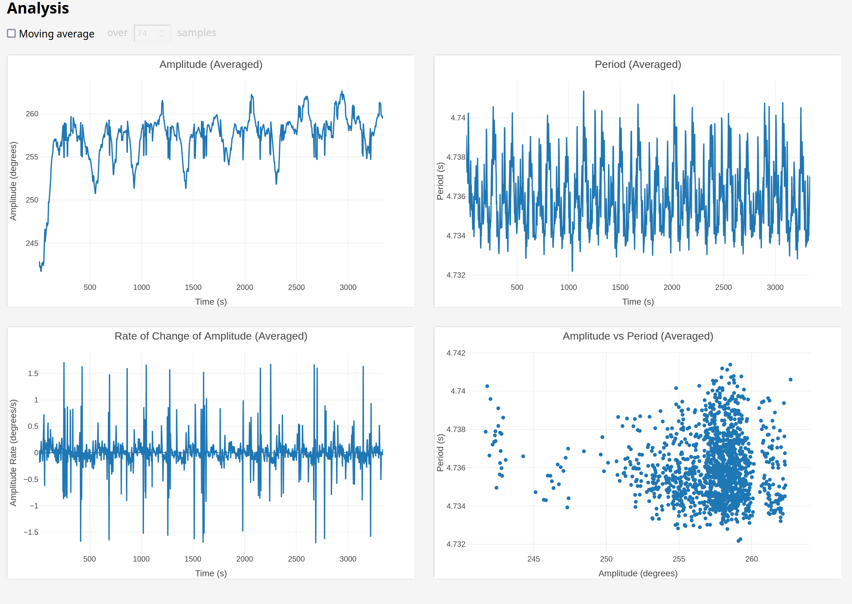 So this actually looks like the fly might be helping a tiny bit! The "hunting amplitude" variation was lower while the fly was installed, which means the amplitude range is lower and therefore the period range is lower.