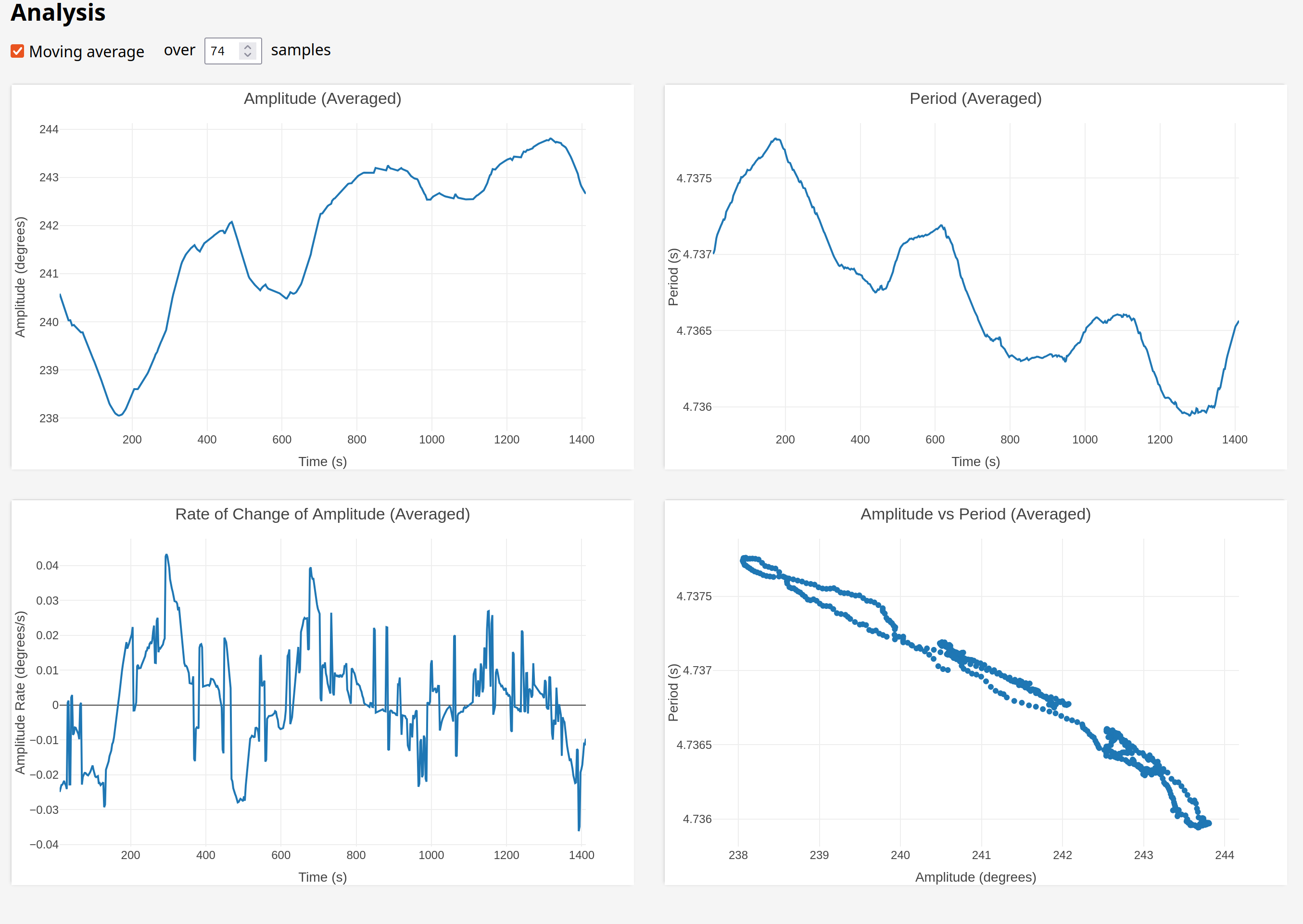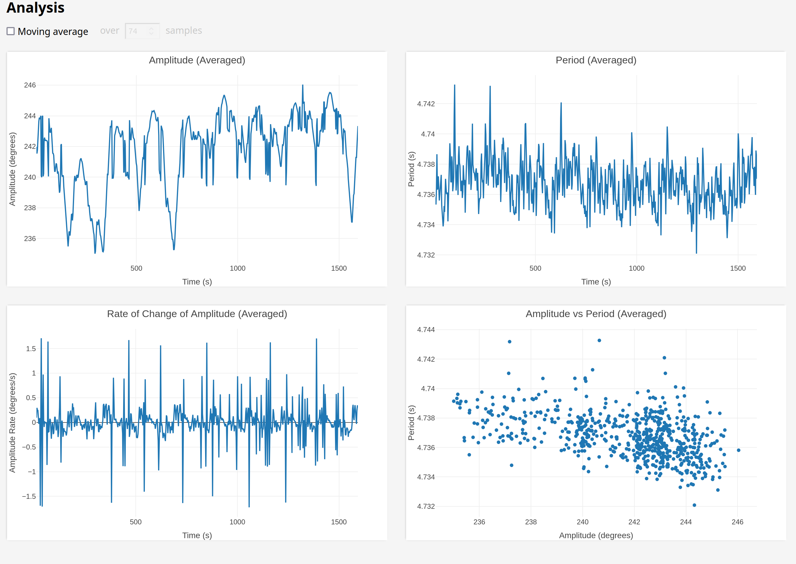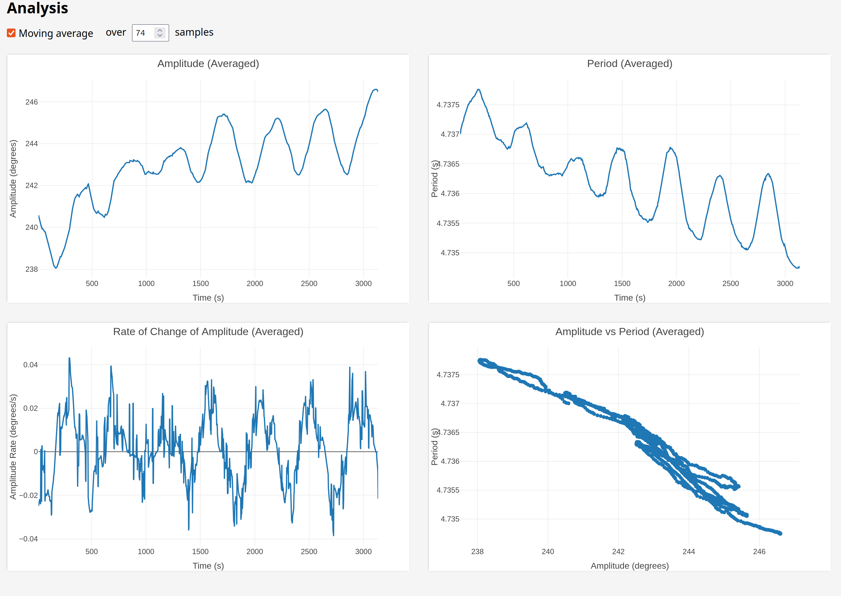 So this actually looks like the fly might be helping a tiny bit! The "hunting amplitude" variation was lower while the fly was installed, which means the amplitude range is lower and therefore the period range is lower.