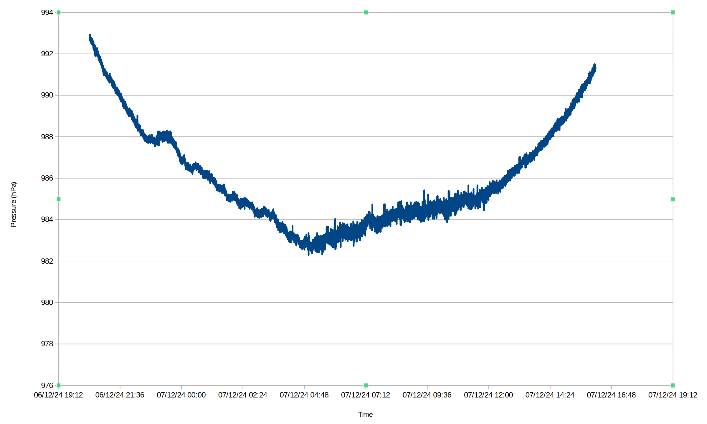 Reached a minimum of about 983 hPa at about 4.45am. Not sure why there is more jitter between the minimum and midday. Wind??