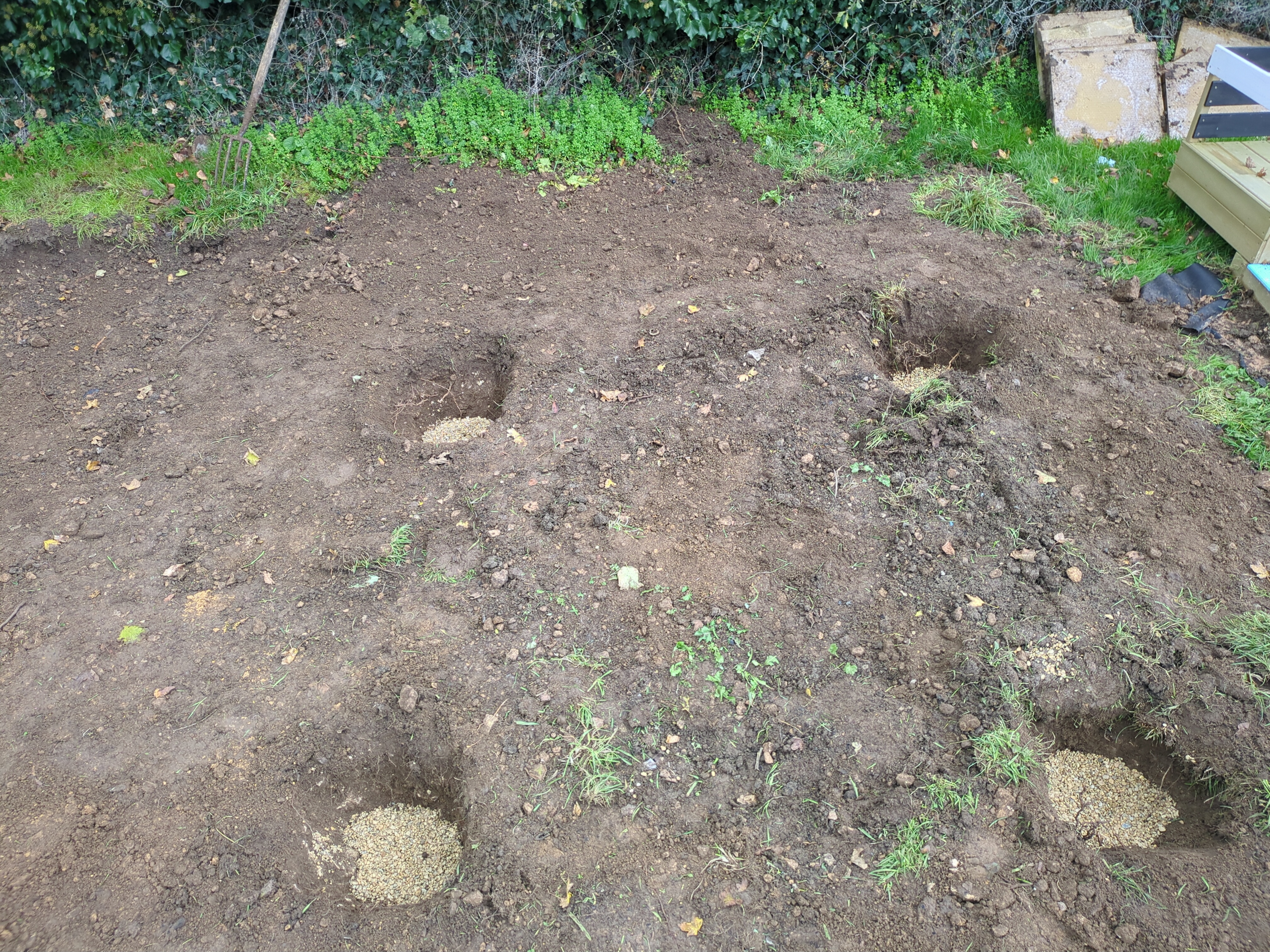 I think 3 bags of gravel for the bottoms of the holes was a bit optimistic! I can't be bothered doing any more digging than absolutely necessary, so there is not going to be a lot of gravel at the bottom. Oh well.