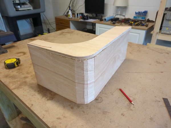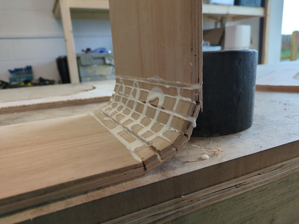 Once that glue has set I am going to attach battens to the insides of this bent piece, and then attach the sides to the battens, and then it should be strong enough to hold its shape and I can have a go at sanding out the lumps.