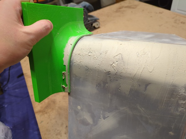 Bodyfilling is really difficult. Even with the tool I don't have a good way to spread the filler over this curve, because the tool seems to pick up wet bodyfiller as you drag it across, it's not like smoothing silicone, more like dough. I think I'm making progress though.