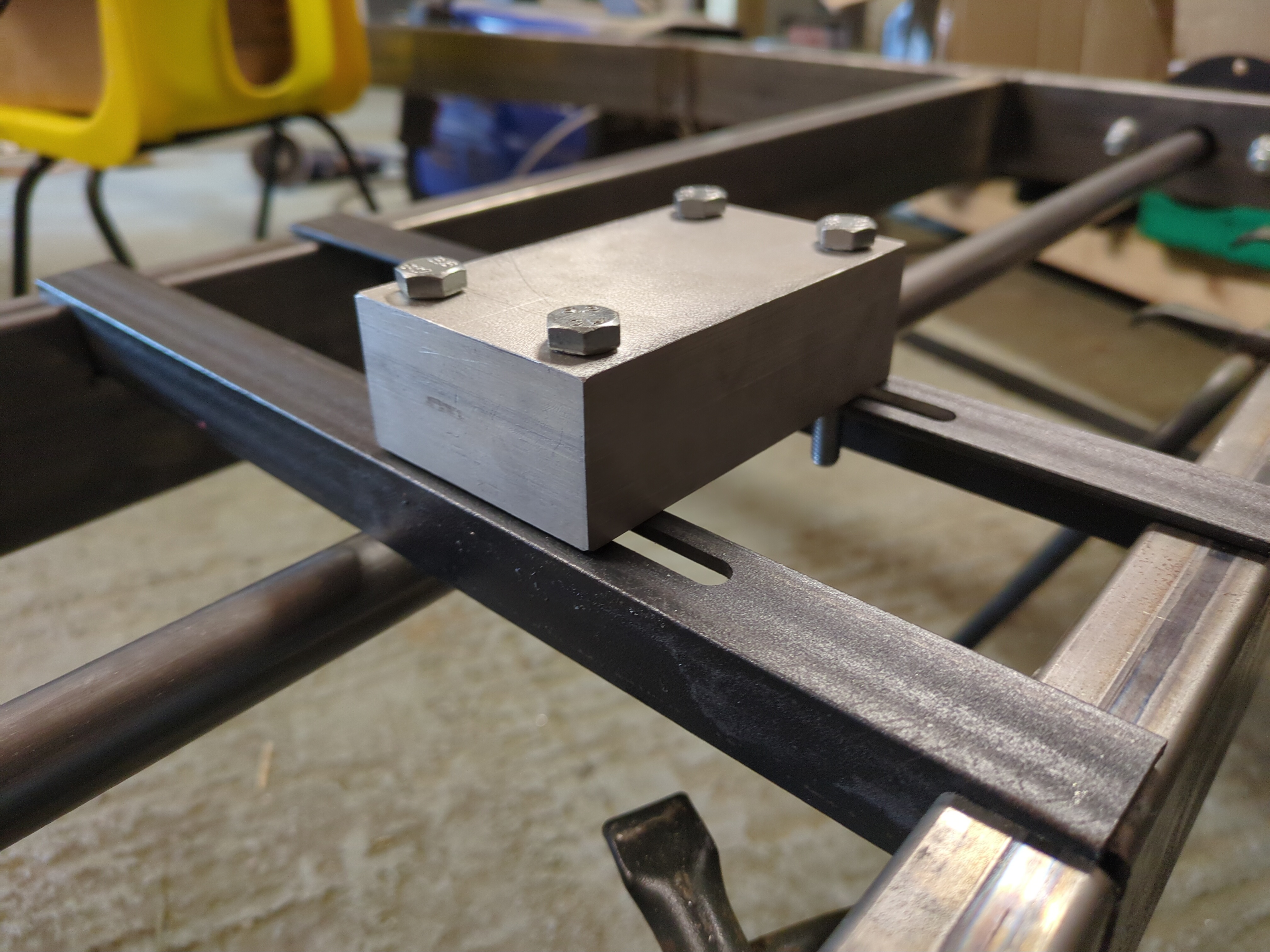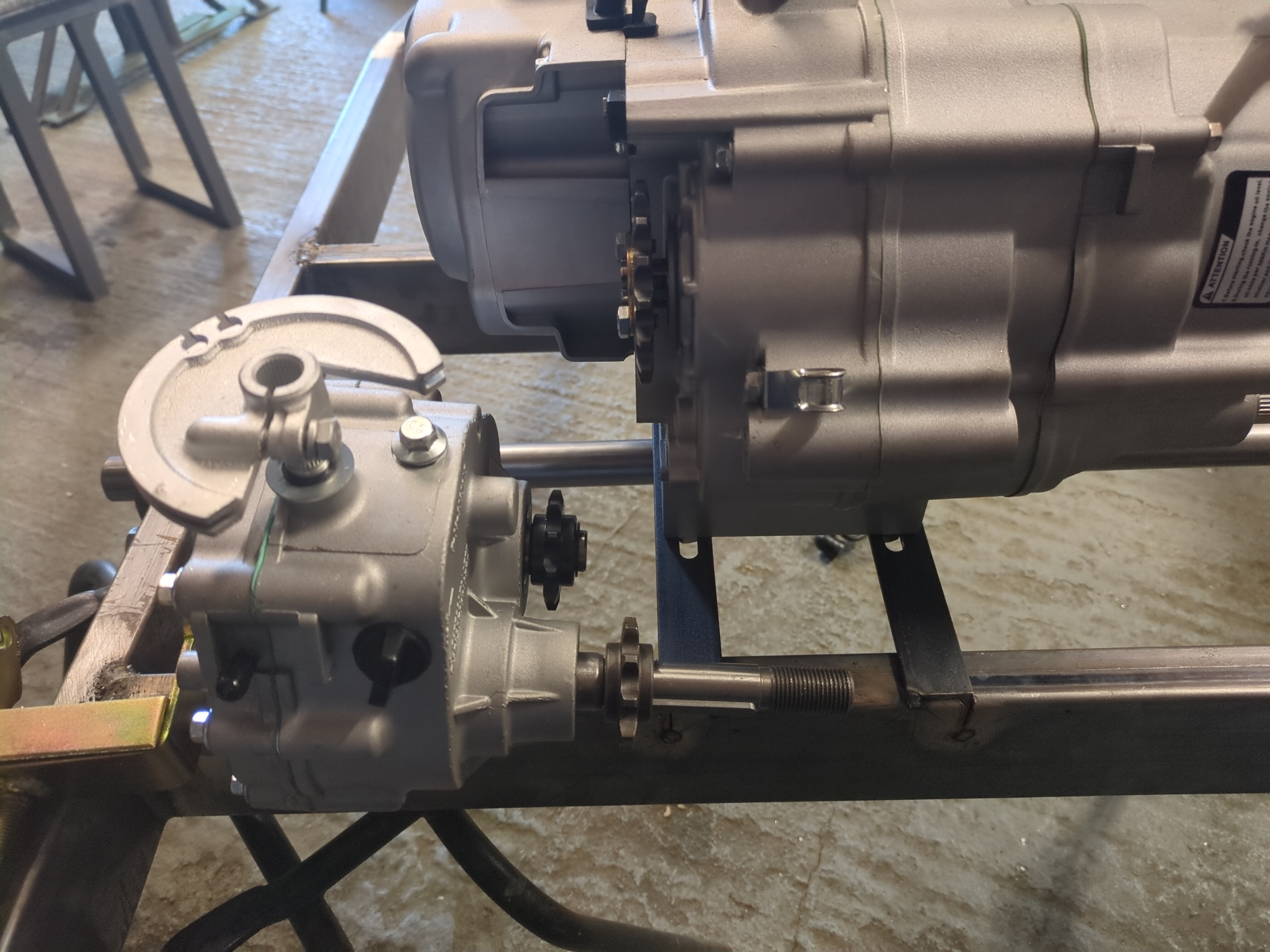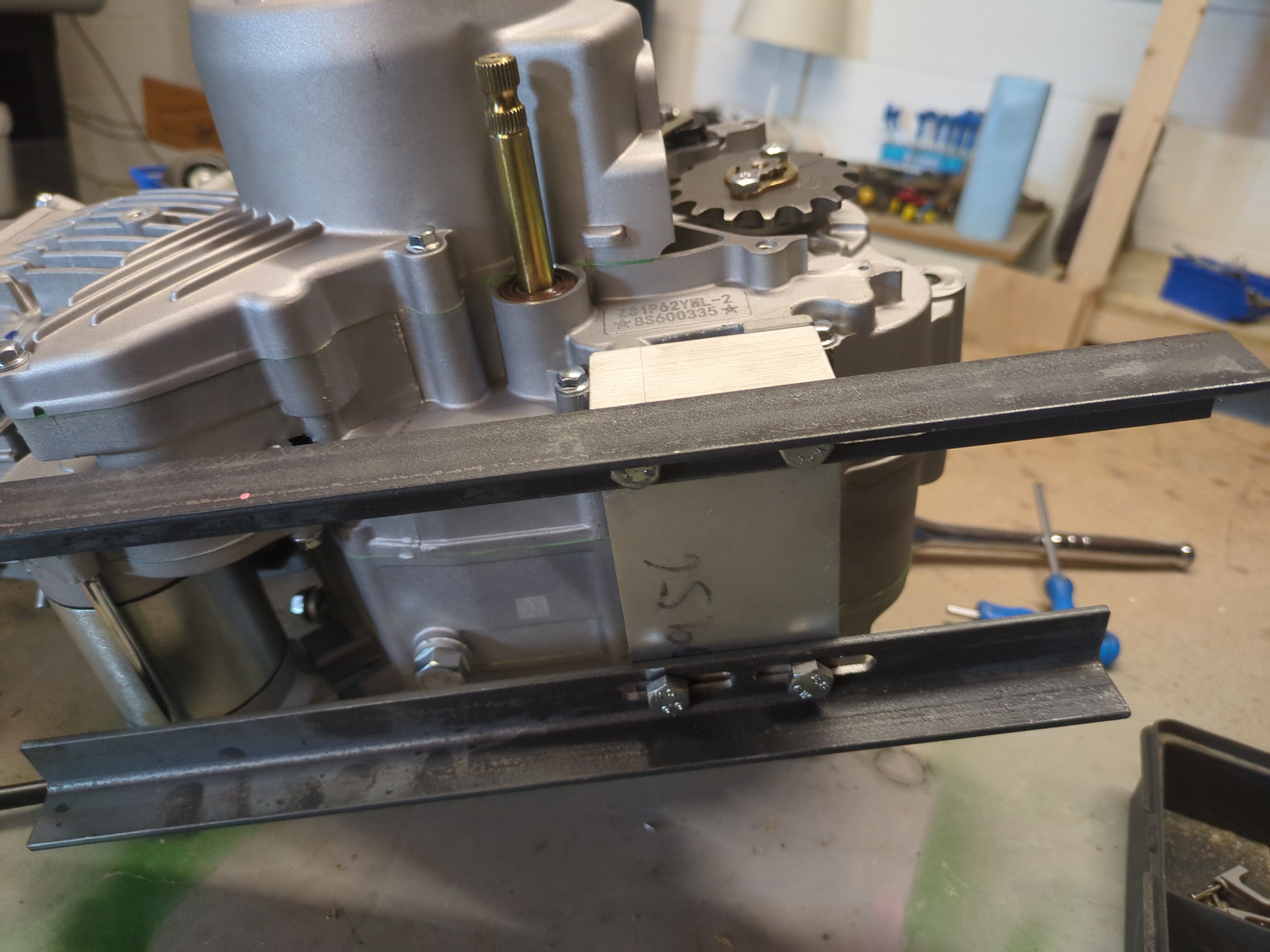 The yellow-zinc-plated clevis-looking part is for tensioning the chain. I think I want to use it, so the mounts for the gearbox will be a couple of sheet metal bracket parts that pick up one of the holes on the gearbox and slot around the chassis rail and get welded to the chassis, and then somehow another bracket nearby that the clevis-looking part can bolt through. With spherical washers? Or what?
