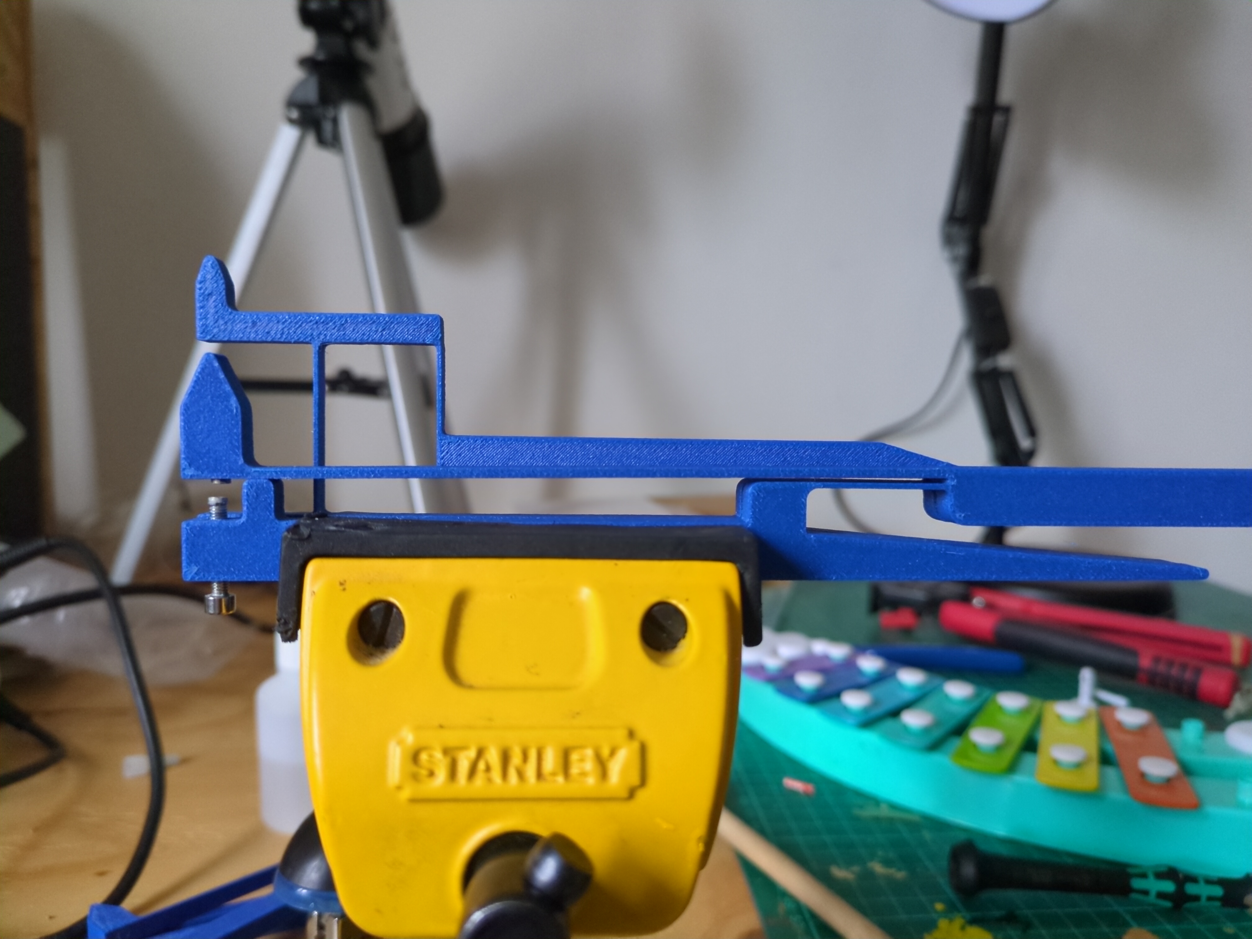 And how do I do the damper? The challenging part is that the tone bars will all be different lengths, so if I want N identical key mechanisms to strike their tone bars in the centre, then the mountings of the tone bars will kind of be "diagonal" across the top of the frame. So there is no easy place to put the damper where it won't interfere with the mounting on at least some of the keys.
