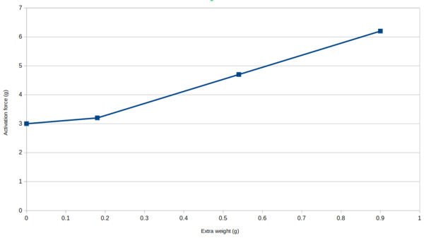 I stuck it on with blu-tack, the blu-tack and ball together weighed 0.5g on my scales, and the initial activation force has increased from about 2.5g to 4.4g. Adding a second ball but no more blu-tack takes it up to 6.0g, and the 2 balls plus blu tack weighs 0.9g. So we can infer that the blu-tack weighs 0.1g.