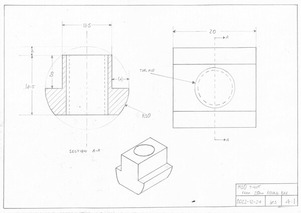 Similar to the other t-nut drawing, except this one is designed to be made from 20mm round bar, because I have plenty handy. Perhaps M10 is a bit too big, maybe M8 or M6 would be a better choice.
