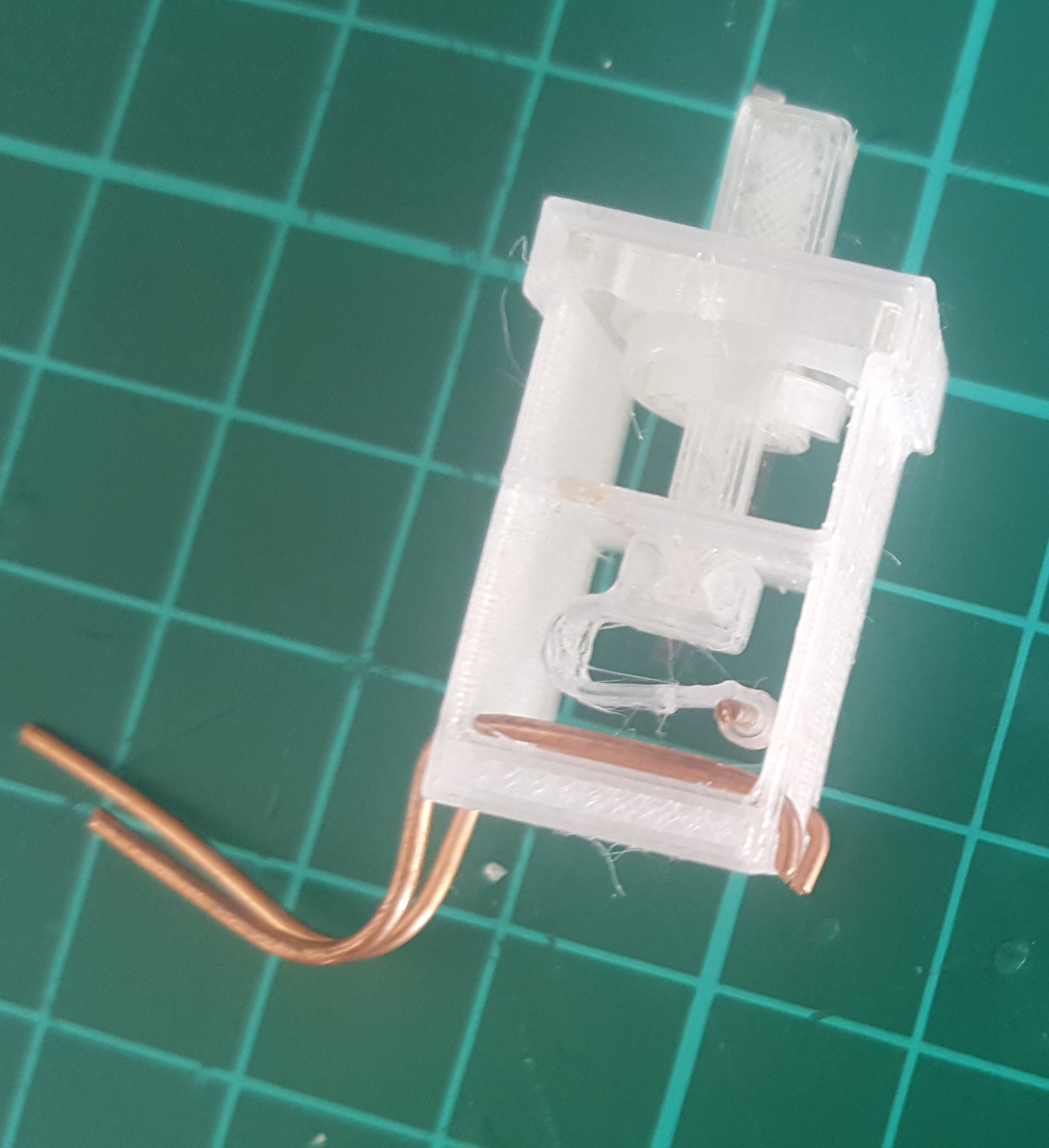 The problem with the switch design from last time was that the copper tape was splitting apart, which prevents it from conducting along its full length. I initially thought I had solved this by applying a 2nd layer of copper tape, but that turned out not to be a workable solution. I did a bunch of tests of various combinations of 50% and 75% activation position, and 1 or 2 layers of copper tape, and found no significant correlation between either of those 2 variables and how long the switch lasts. The switches lasted between 225 presses and 330,000 presses before failure. 7 failed by the copper tape splitting, 2 failed by the PETG spiral spring breaking (both after more than 200,000 presses), and 1 didn't seem to have any broken parts, it just wasn't reliably working any more.