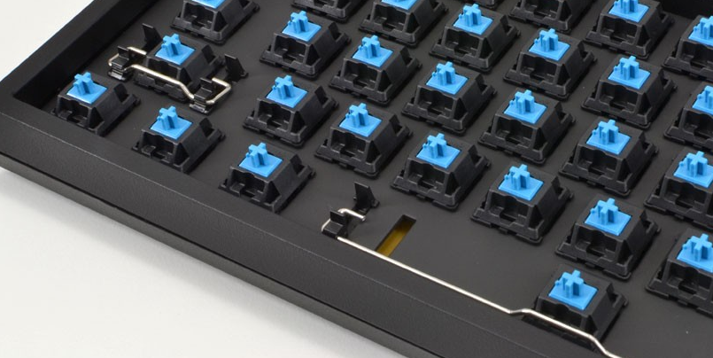 I also probably need to add some sort of stabiliser, at least to the space bar and probably to the enter key, backspace key, and right shift key as well. A stabiliser is a mechanism underneath the keycap that keeps the keycap moving up and down vertically, instead of rocking over the switch, in the event that it is pressed on one side instead of in the middle. It typically works exactly the same way as an anti-roll bar on car suspension: when one side moves down, the bar rotates from that end. The rotation is transmitted to the other end of the bar, which also rotates, and pulls the other side down.