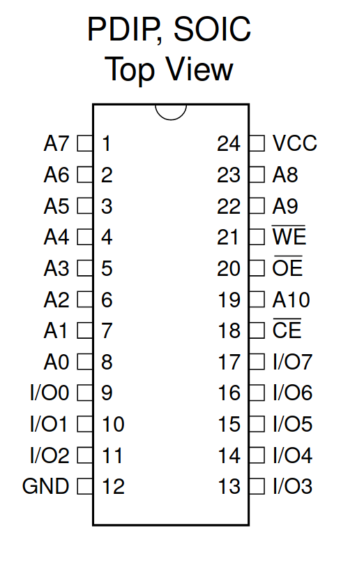 The AT28C16 EEPROM stores 2048 bytes, which means to access it all you need to control 11 address lines and 8 data lines. You also need to operate "chip enable" (pull low to enable the AT28C16), "output enable" (pull low to enable output), and "write enable" (pull low to enable writing). That means in total you need to control 22 pins, but the Arduino Uno only has 12 general-purpose digital IO pins. Problem. Fortunately, there are some tricks that make it workable.