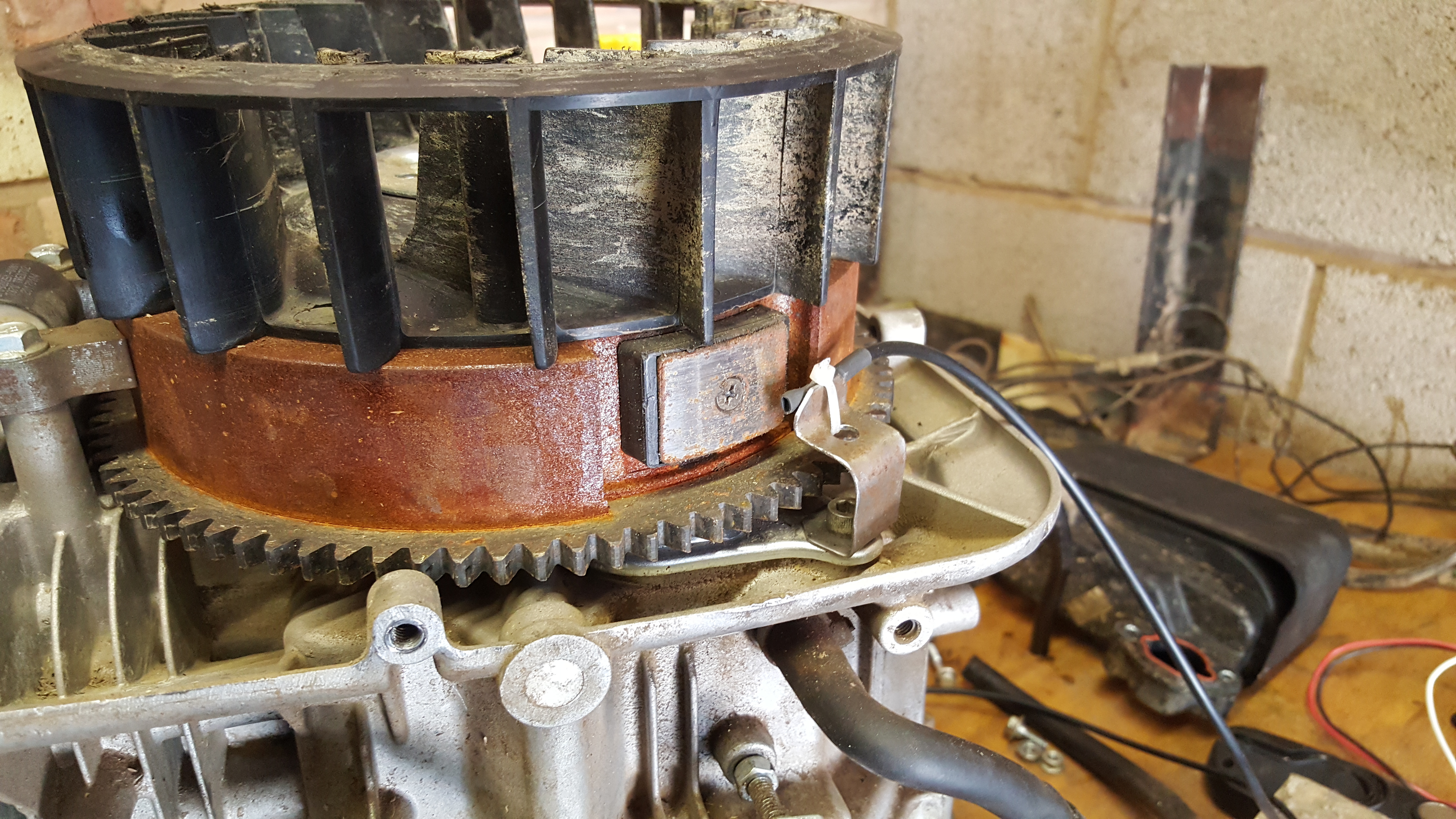 The flywheel has a large magnet on it for the ignition electronics, so to detect the engine RPM I bent up a small piece of steel to hold a magnet sensor near the flywheel: