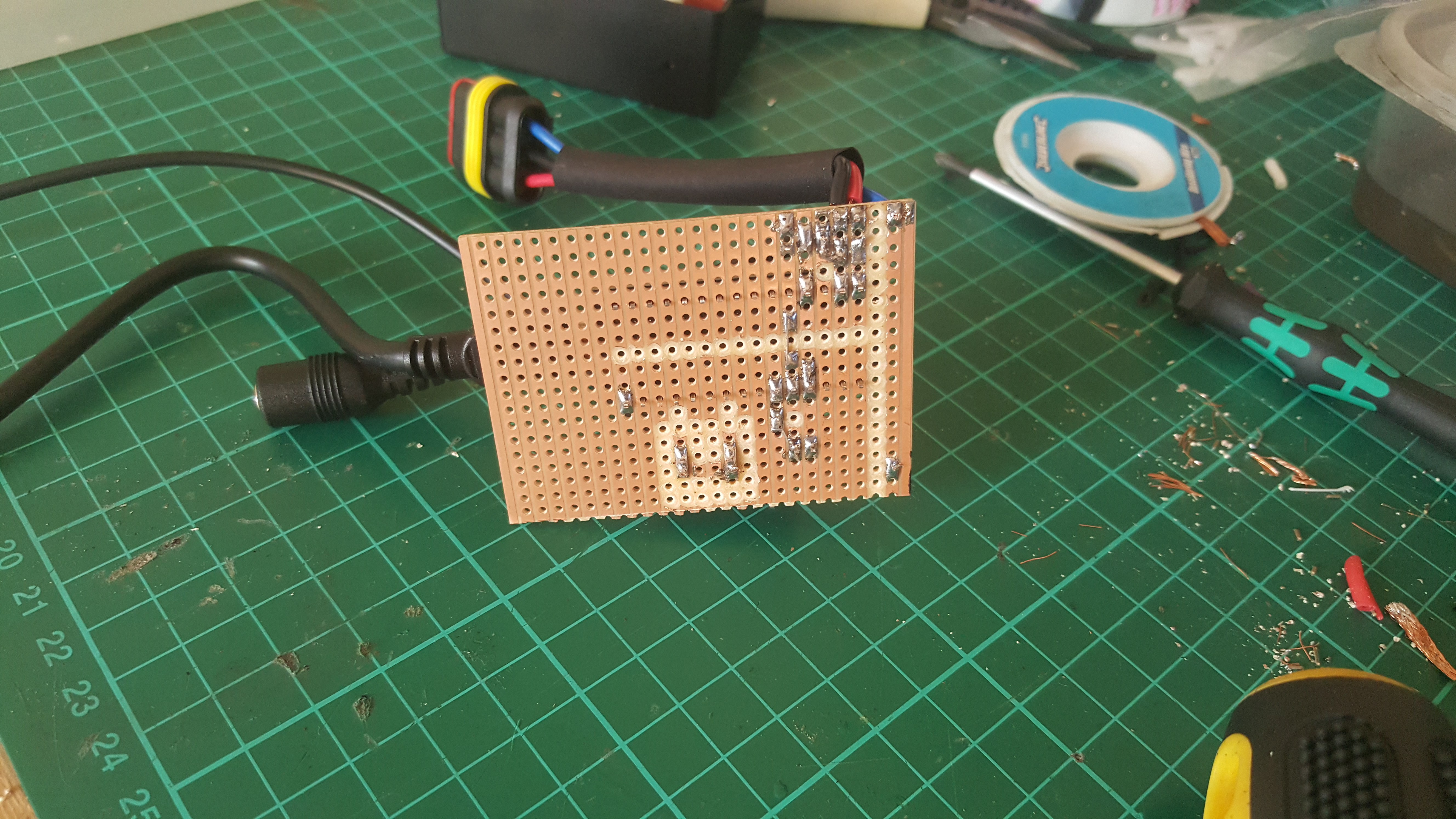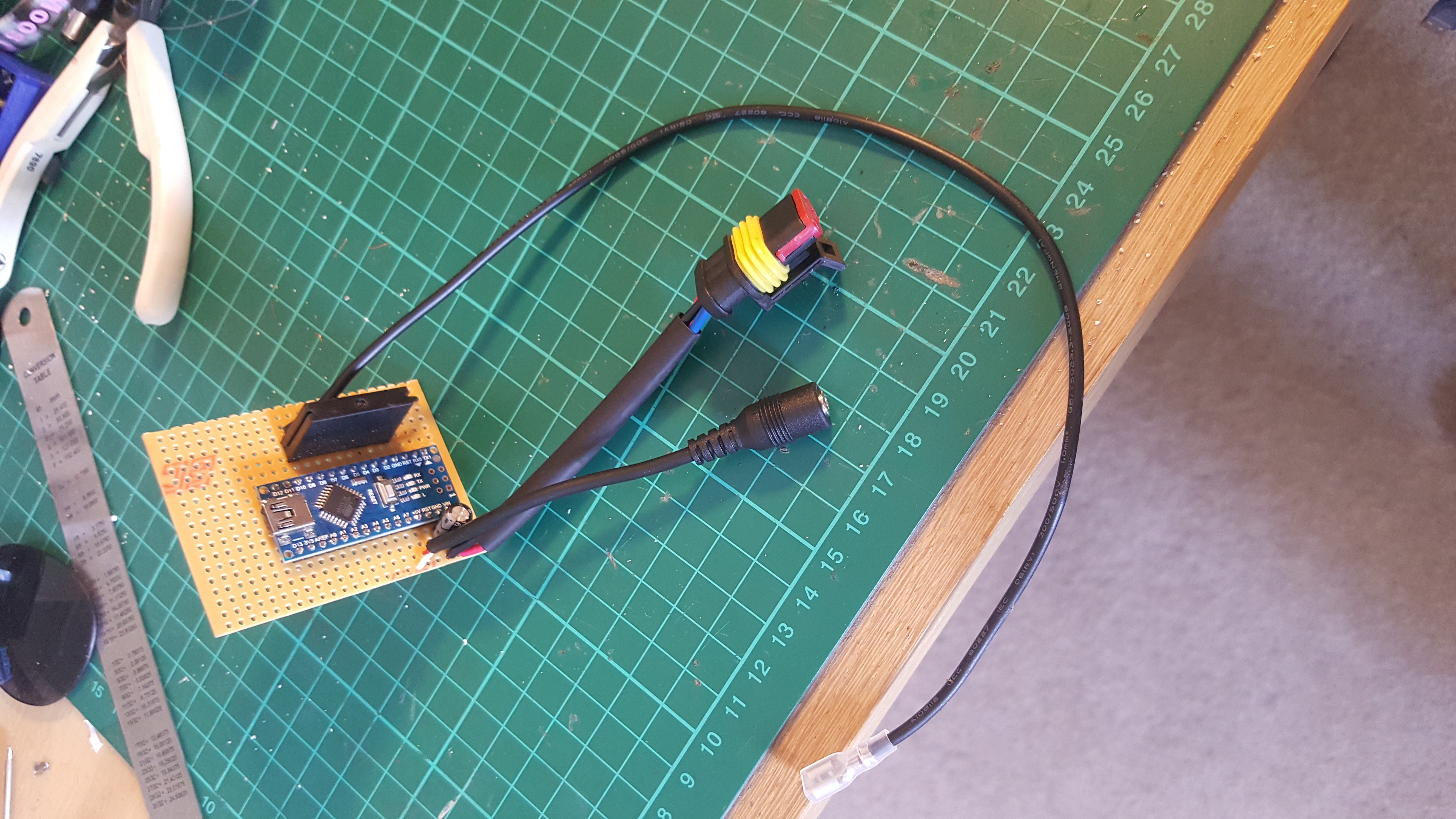 Having made the rev limiter work on a breadboard, I made up a piece of copper stripboard with an Arduino Nano, the solid-state relay, and the requisite connectors: