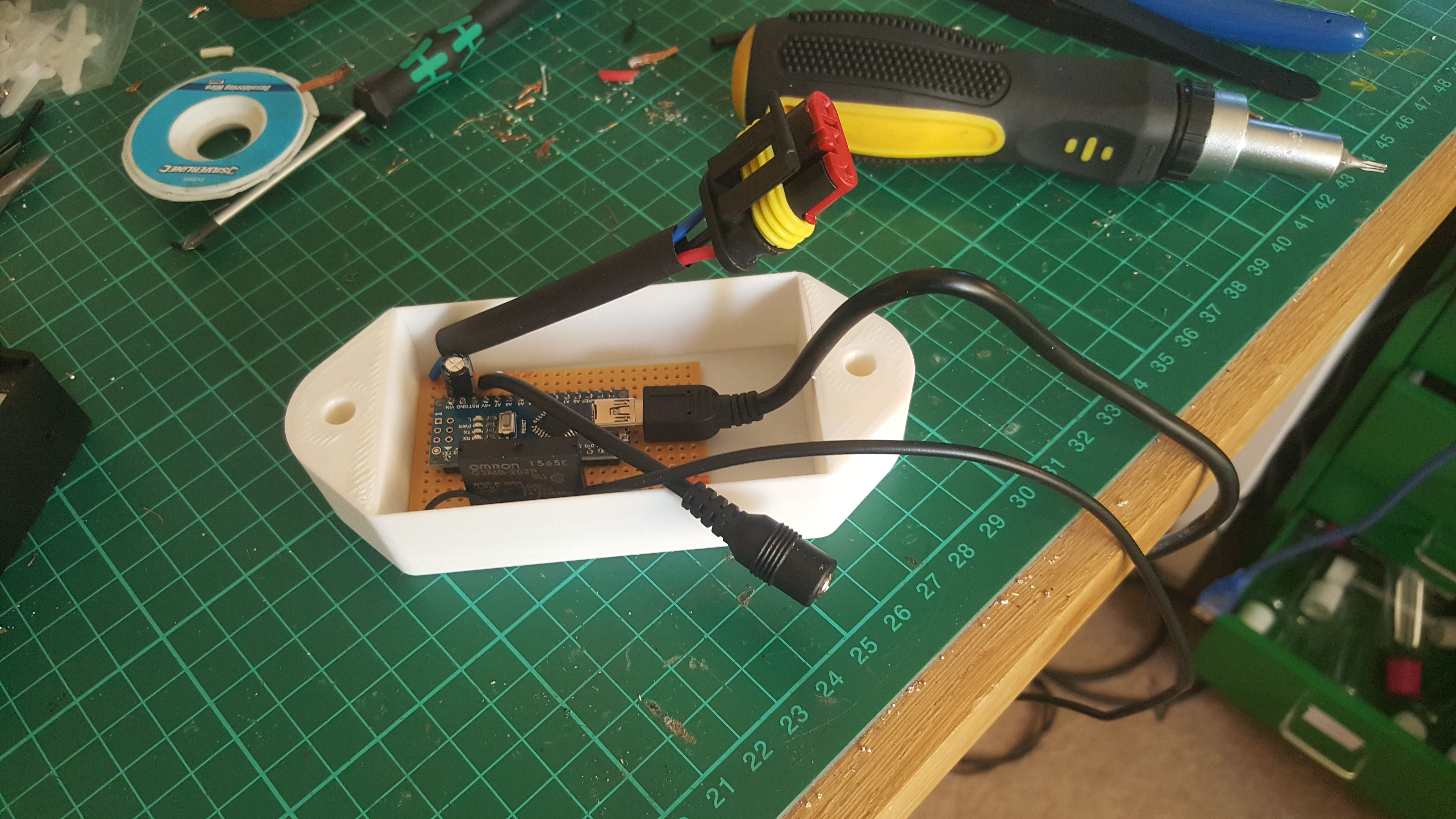 As you can see, the actual project only takes up about half the space inside the case. The rest is taken up by the inconvenient USB plug. A much better way to design the case would be to have the wires coming out of one end instead of out of the top. It would also be helpful to lie the solid-state relay on its side, parallel to the Arduino.