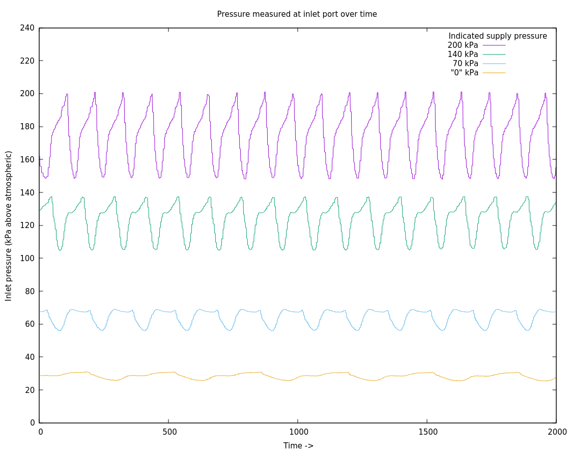 Last time, I got the supply pressure from the number shown on the gauge on the compressor. I don't have a lot of confidence in that gauge, and now that I have the inlet pressure sensor I can use that instead. I'm saying that the supply pressure at any given time is the peak pressure from the inlet pressure sensor over the last 0.6 seconds. This is a long enough window that it covers a peak from the last cycle even at the lowest engine speeds.