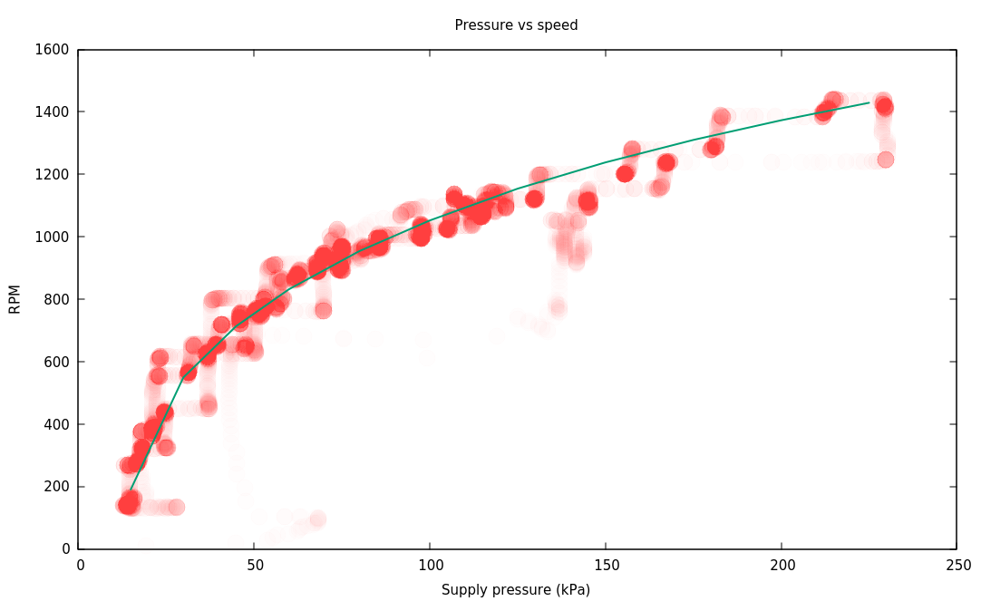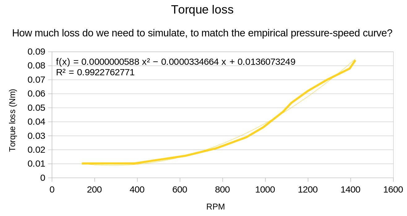 Armed with a representative sample of speed and pressure datapoints, I manually adjusted the loss torque in the simulator until the simulated engine speed matched the real engine speed for the same supply pressure (this time also using the "reservoir" supply model I described in "More inlet pressure measurements").