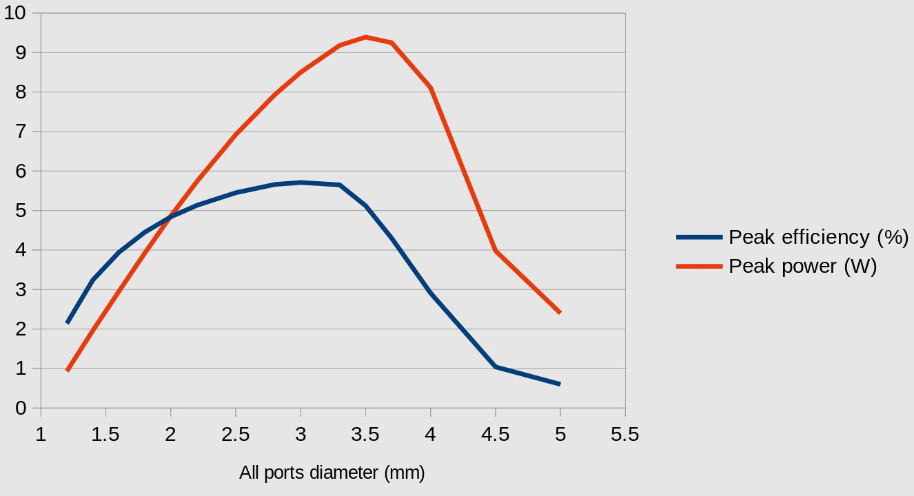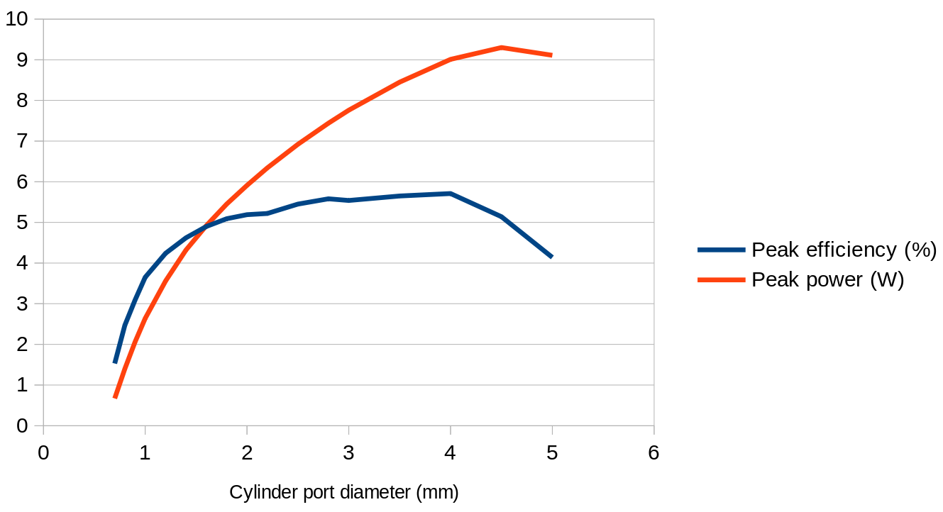 The standard cylinder port is 2mm. We can improve both peak power (by about 50%!) and peak efficiency by drilling this out to maybe 4mm. (Though note that peak power and peak efficiency are not achieved at the same speed).