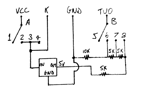 So I designed a much simpler, purely analogue, control scheme. I bought a "3 pole 4 throw" rotary switch off eBay. A "2 pole 4 throw" switch would do, but is harder to find, or even a "1 pole 3 throw" if you're content with having a separate power switch. I wired it up so that in one position the "K" wire is disconnected from "VCC", and in the other 3 positions "K" is connected to "VCC", and "TUO" is connected to a point in a voltage divider made of 3 5K resistors and a 10K resistor. That gives a 1v drop across each of the 5K resistors, which gives us the 2v, 3v, and 4v levels needed to select the different pedal assist modes. Here's a schematic to explain what I mean: