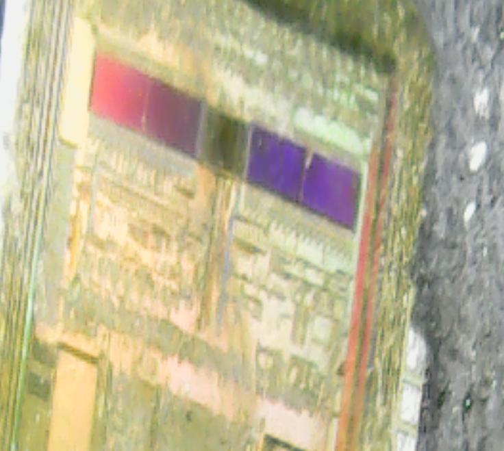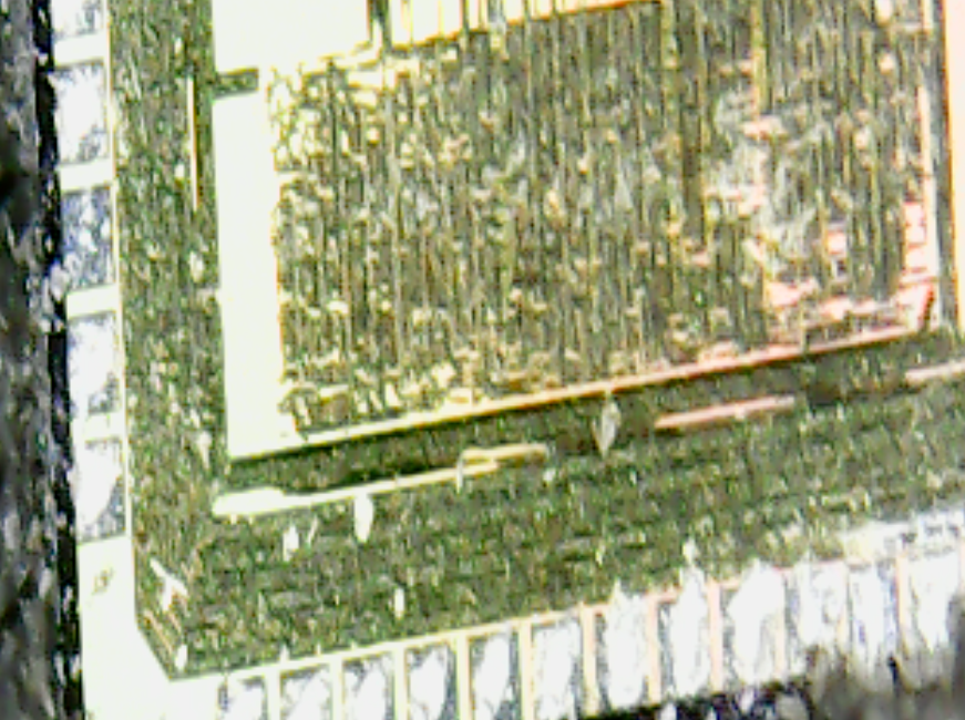 The USB microscope focuses on a very small area (especially at zoom levels nearing the heady heights of 16x...) so it was quite difficult to position the die in the frame properly. It was also quite difficult to focus the image since the microscope has an extremely short focal length, although it thankfully does have a manual focus. This is the first picture I managed to get:
