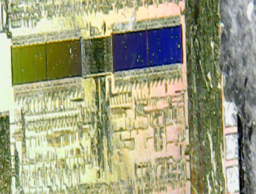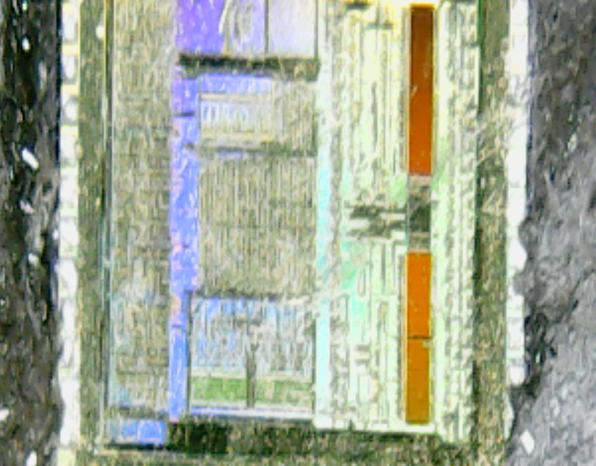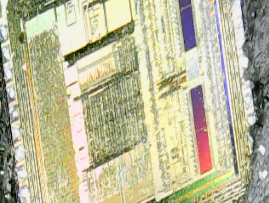 Not really enough detail to make anything out (at least, not to my untrained eye). Somebody who knows more about integrated circuits might be able to identify the 2 large rectangles, I suspect they're memory of some sort.