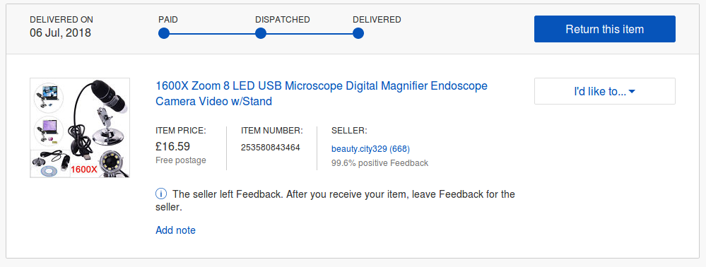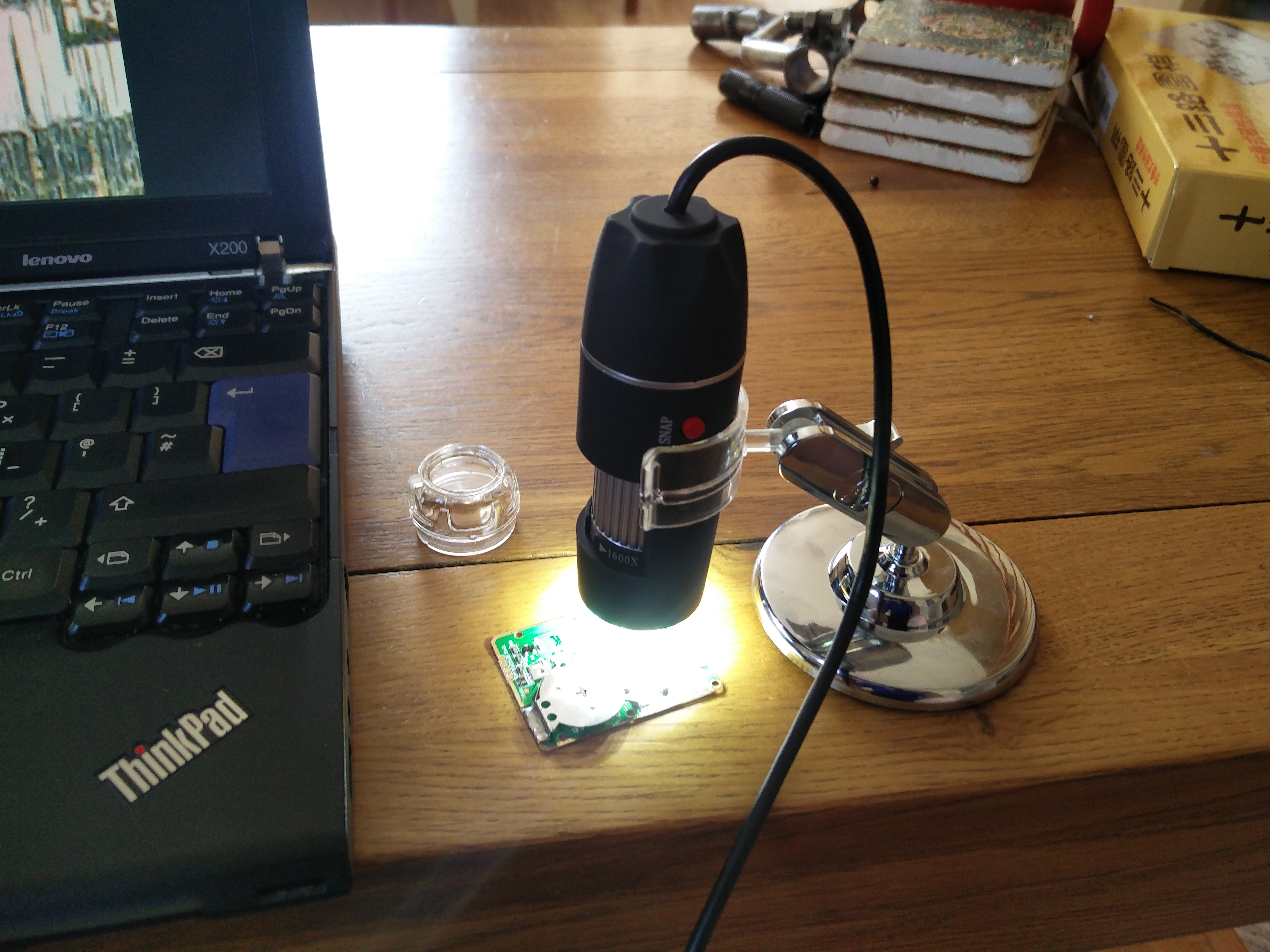 It would be cool to get a more detailed shot than this, so I went on eBay and bought myself a "1600X Zoom 8 LED USB Microscope Digital Magnifier Endoscope Camera Video w/Stand" from a seller called "beauty.city329". The "1600X" turned out to be optimistic by a factor of at least 100.