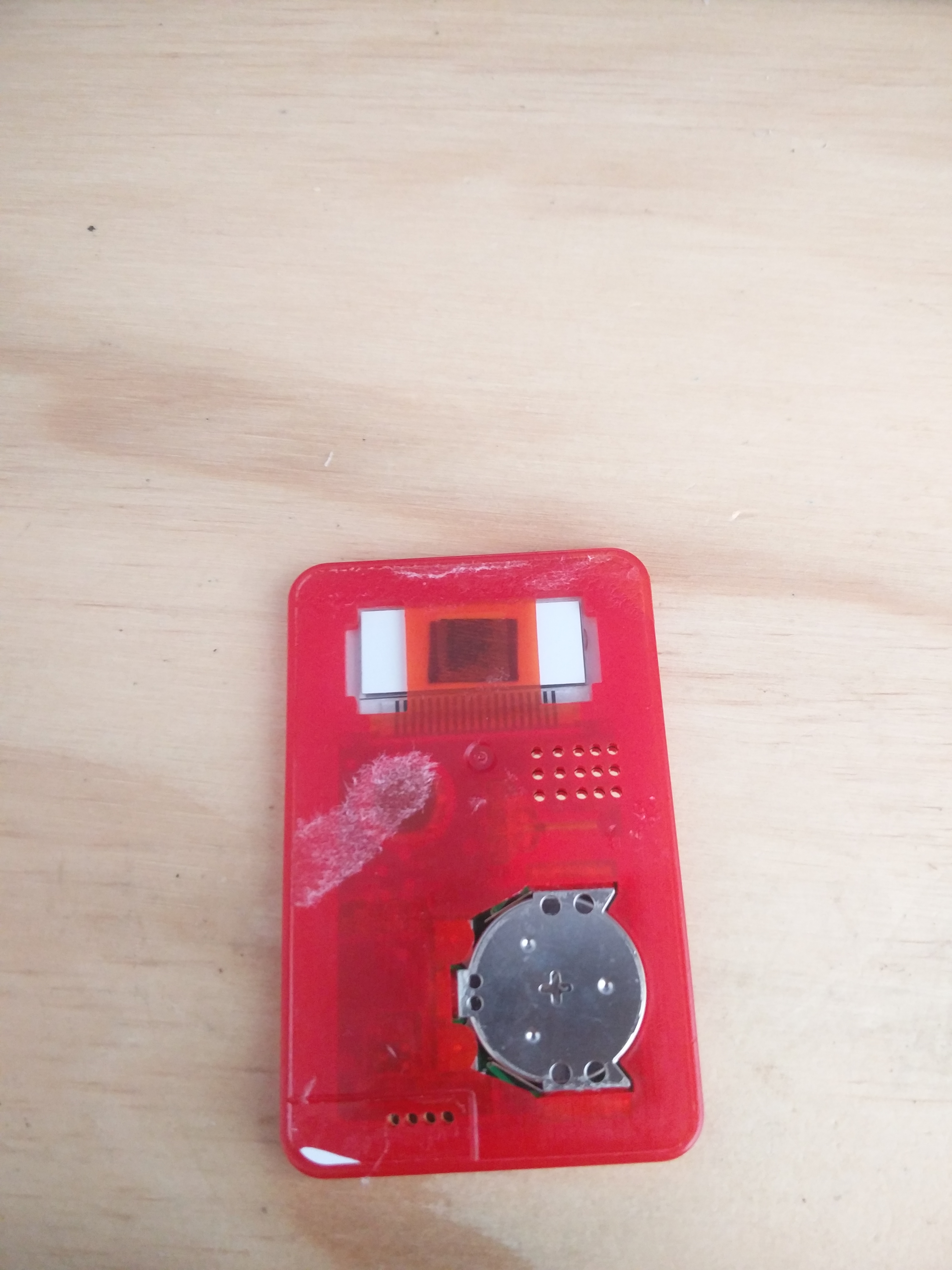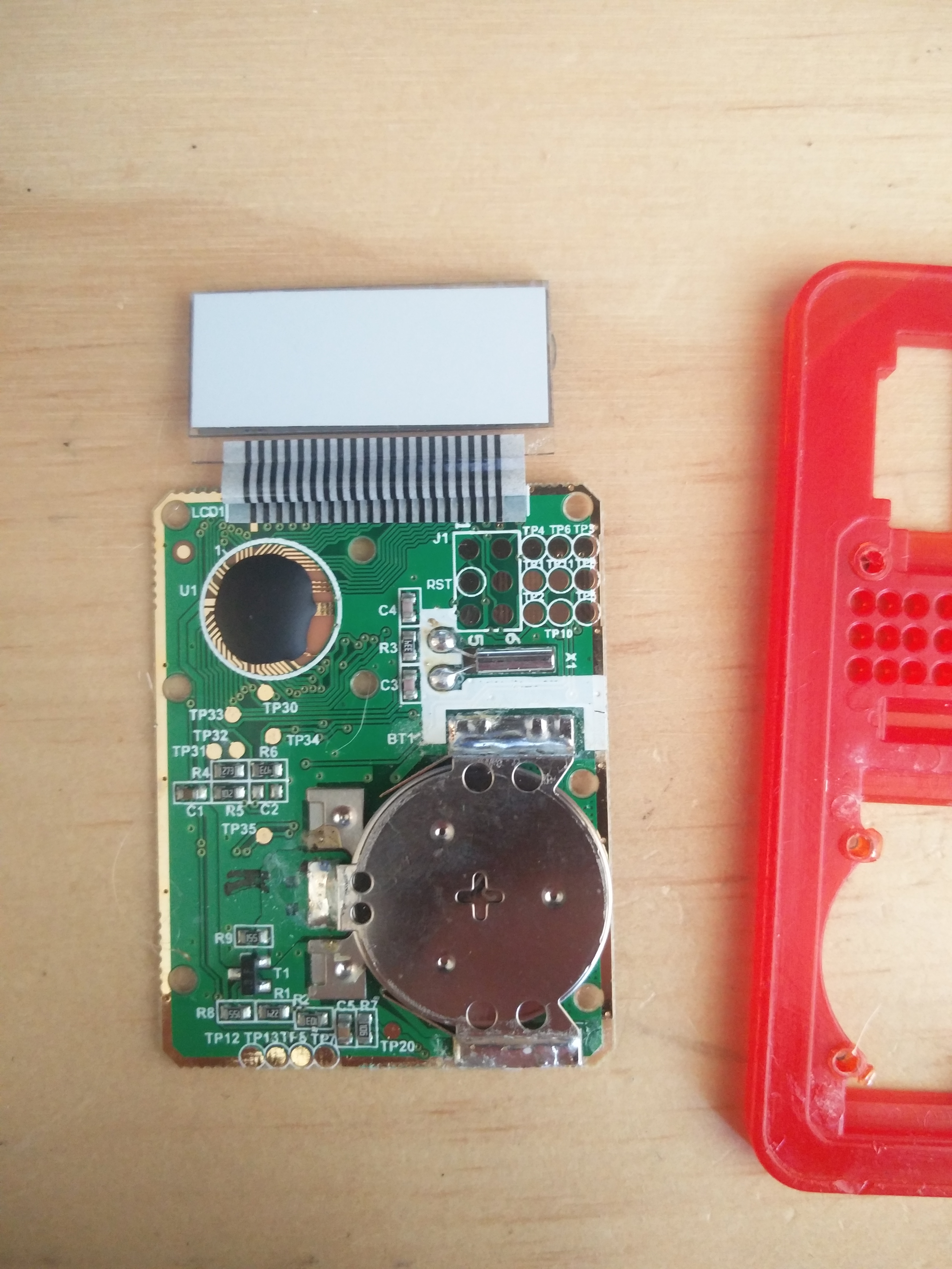 The traces are gold-plated, which is a surprise. Possibly to help conductivity because they're so thin. Apart from that, there's almost nothing to see here. The battery takes up over a quarter of the board. There are a handful of resistors and capacitors. One transistor. A crystal oscillator. And a bunch of exposed gold-plated pads, mostly labelled "TPxx". These are "test points", and they line up with the holes in the plastic case, so that explains what the holes were for.