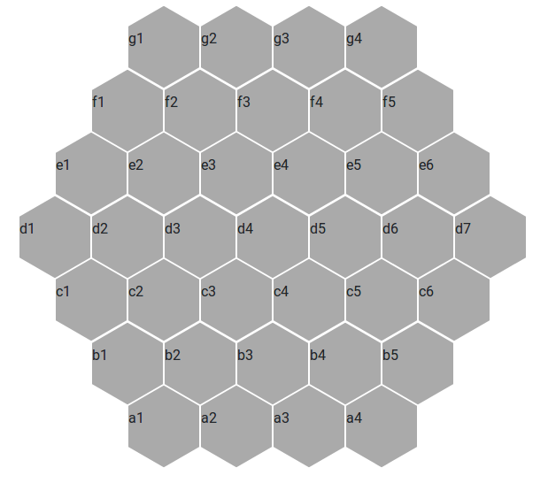 It's helpful to be able to unambiguously identify the spaces on the board. For this reason, I propose labelling the tiles as in this image: