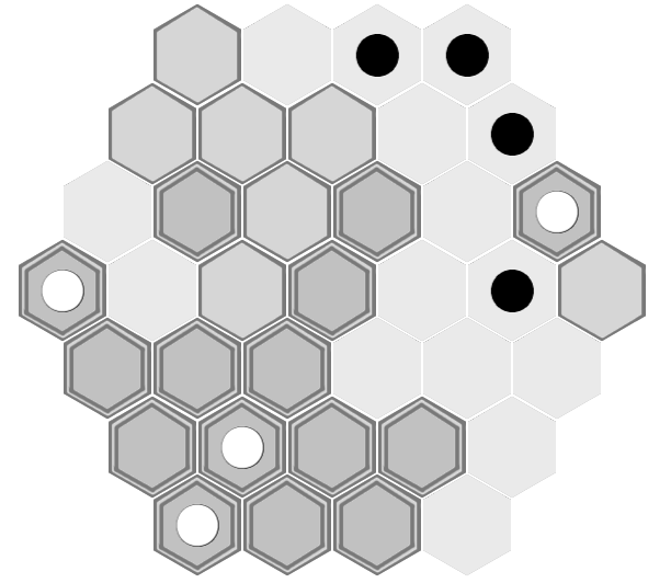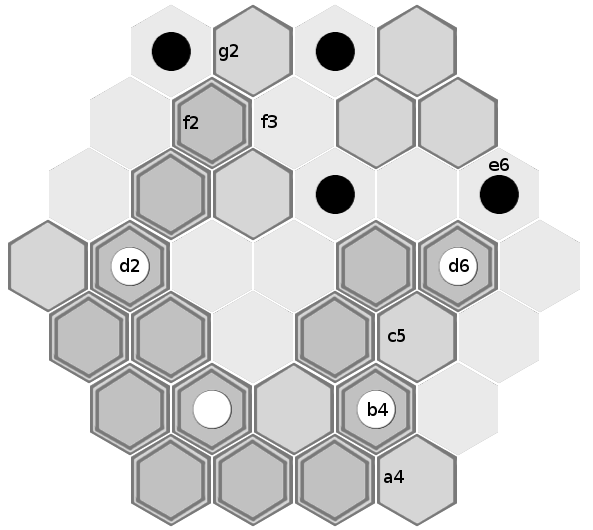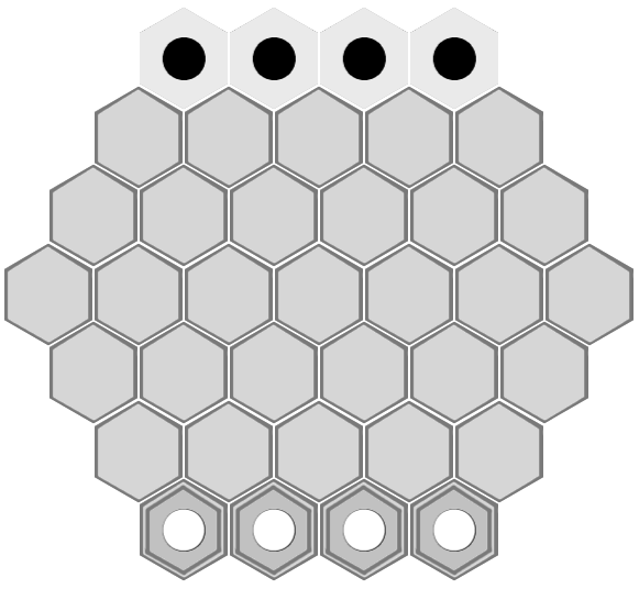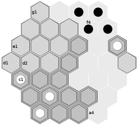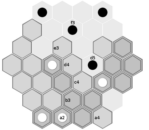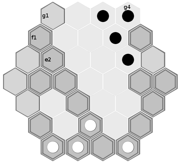 Black's best path is now shorter than white's, and black wins the game. (Black could have captured white's piece on e6 on either his second or third turn, but doing so conveys no advantage here. It would mean forgoing either one tile movement or one piece movement, but black would still be able to block white's progress and would still win the game).