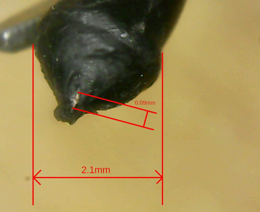 I tried to drive the moisture out of my spool of black PETG by baking it in the oven for a few hours, but when I returned to get it out of the oven I was disappointed to find that the temperature had been set to 100°C instead of 50°C. The spool was fused together and unusable. Bummer. Oh, well, I'd been planning to order a spool of clear PETG soon anyway. In the mean time, I have a spool of "PIPG" or "post-industrial PET-G" that I'm not particularly fond of because it tends to block the nozzle. I think "post-industrial" means it is made out of factory floor sweepings. Here's a photograph of what I pulled out of the nozzle one time, taken with a USB microscope: