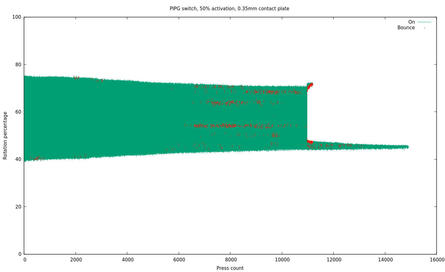 Much more promising. We got almost 11,000 presses before it went bad. There were a handful of "bouncy" presses after ~6,000, but it's not obvious that these would have been a big problem. The keyboard controller will need to have switch debounce logic anyway, so as long as it was just a small bounce and not a large discontinuity, I think it would be fine.