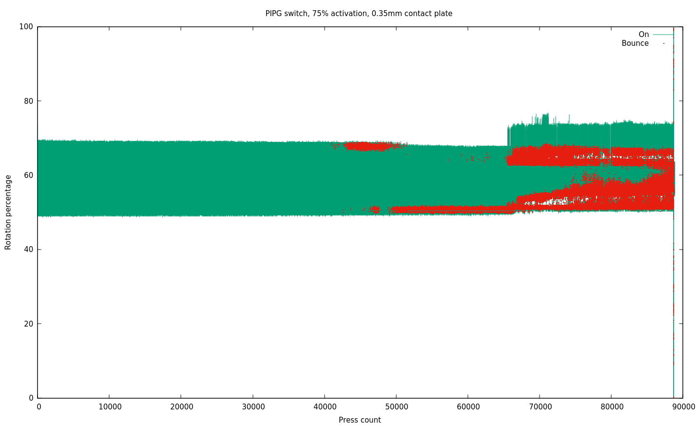 This is much better. We got over 40,000 presses before the switch showed any signs of trouble, and about 65,000 before it became unusably bad. Also note that the variation in activation position is much lower here than in the previous test, presumably due to less stress on the flexible plate. At nearly 90,000 presses it stopped registering entirely. At that point I inspected it to try and see what had happened, and was surprised to find nothing obviously wrong! I prodded and poked at it, and manually tested it a few times, and nothing seemed wrong, so I put it back in the tester to see what would happen.