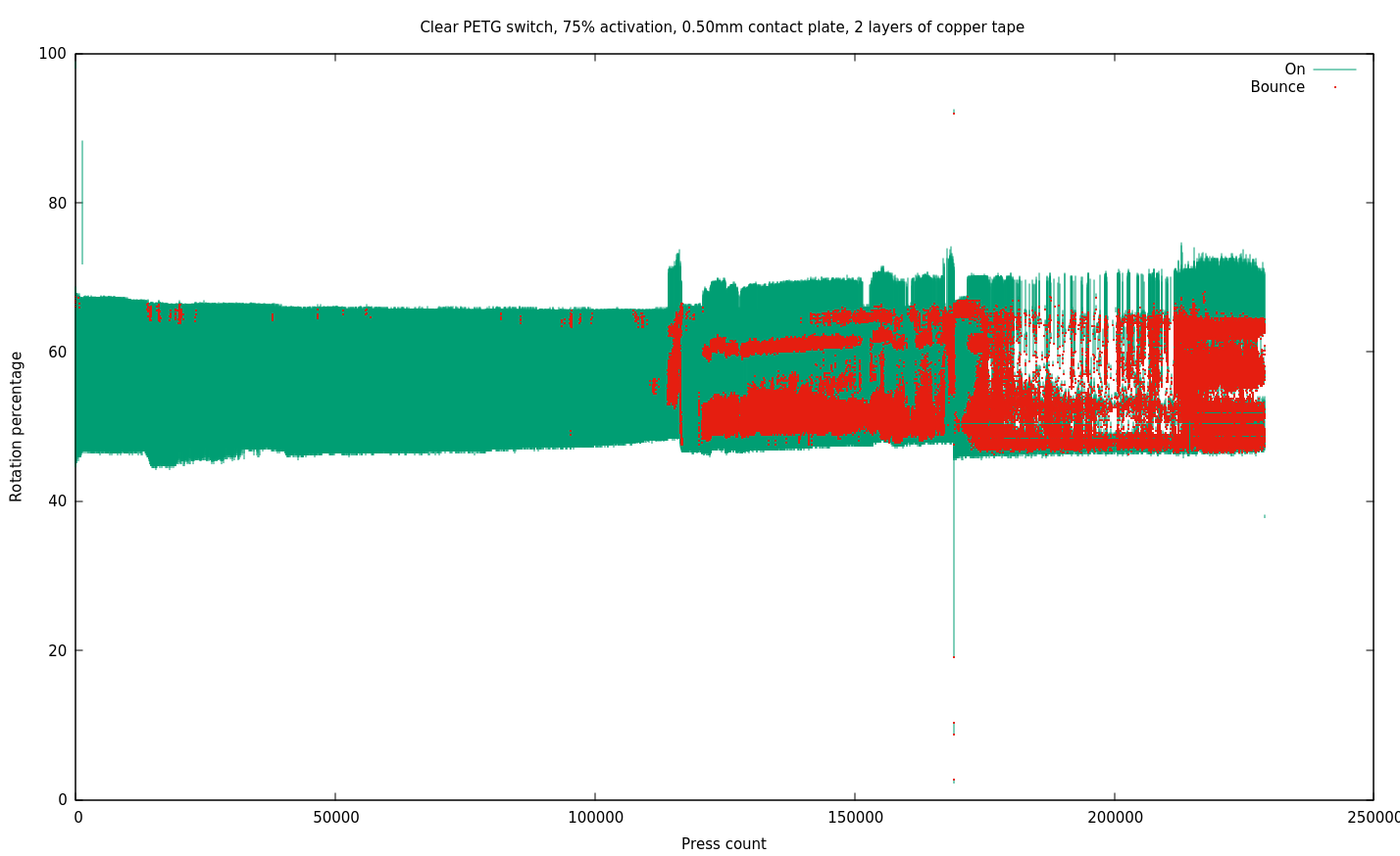 The copper tape broke at about 11,000 presses, which is about the same as we got with the activation position at 50%.