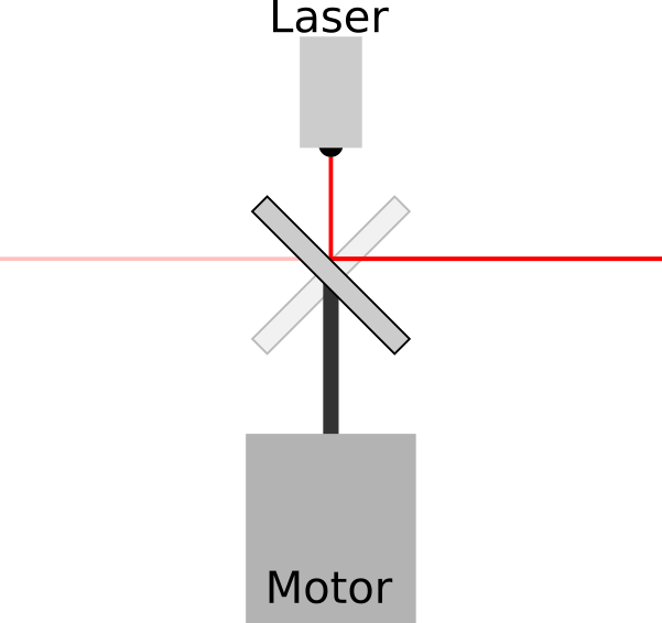 The motor is mounted perfectly vertically, the laser beam is co-axial with the motor, and the mirror is at a perfect 45°. As the motor (and therefore the mirror) rotates, the laser beam sweeps out a horizontal plane parallel to the ground.