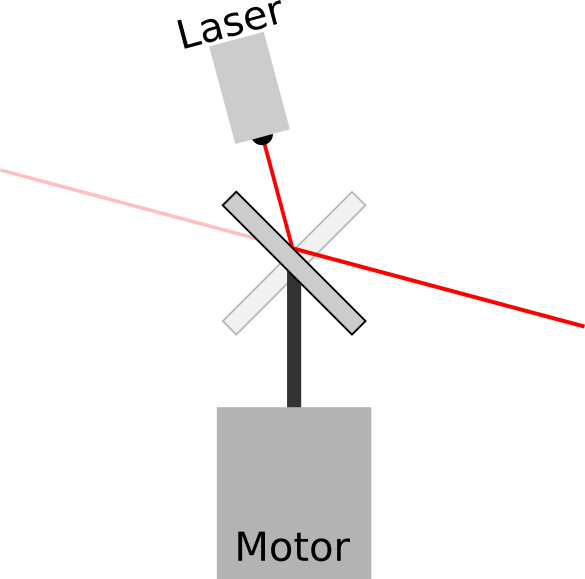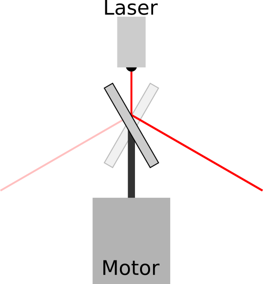 I first started thinking about laser levels a while ago when Jez got one and explained to me how great it was. Yesterday I came back to them after watching AlphaPhoenix's video on why smoke from a soldering iron always goes towards your face, in which he builds a device that projects a laser beam to illuminate a cross-section of smoke in air. In principle it is actually quite easy: you just need to mount a mirror on a motor at 45° and spin it really fast, and then point a laser at the mirror. As the mirror spins, the laser beam is projected in different directions around in a circle, sweeping out a plane in space. If you can make sure the plane is level to the ground, then you have a functional laser level.