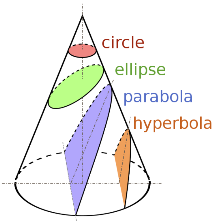 The cone shown here is the cone of light from the laser, and the intersections of the flat coloured shapes with the cone represent the path that would be traced out on a flat wall at different angles relative to the cone: the hyperbola is if the wall is steeper than the sides of the cone, the parabola is if the cone's sides are parallel to the wall, the ellipse is if the cone's sides are steeper than the wall, and finally the circle is achieved if the cone's axis is perpendicular to the wall surface.