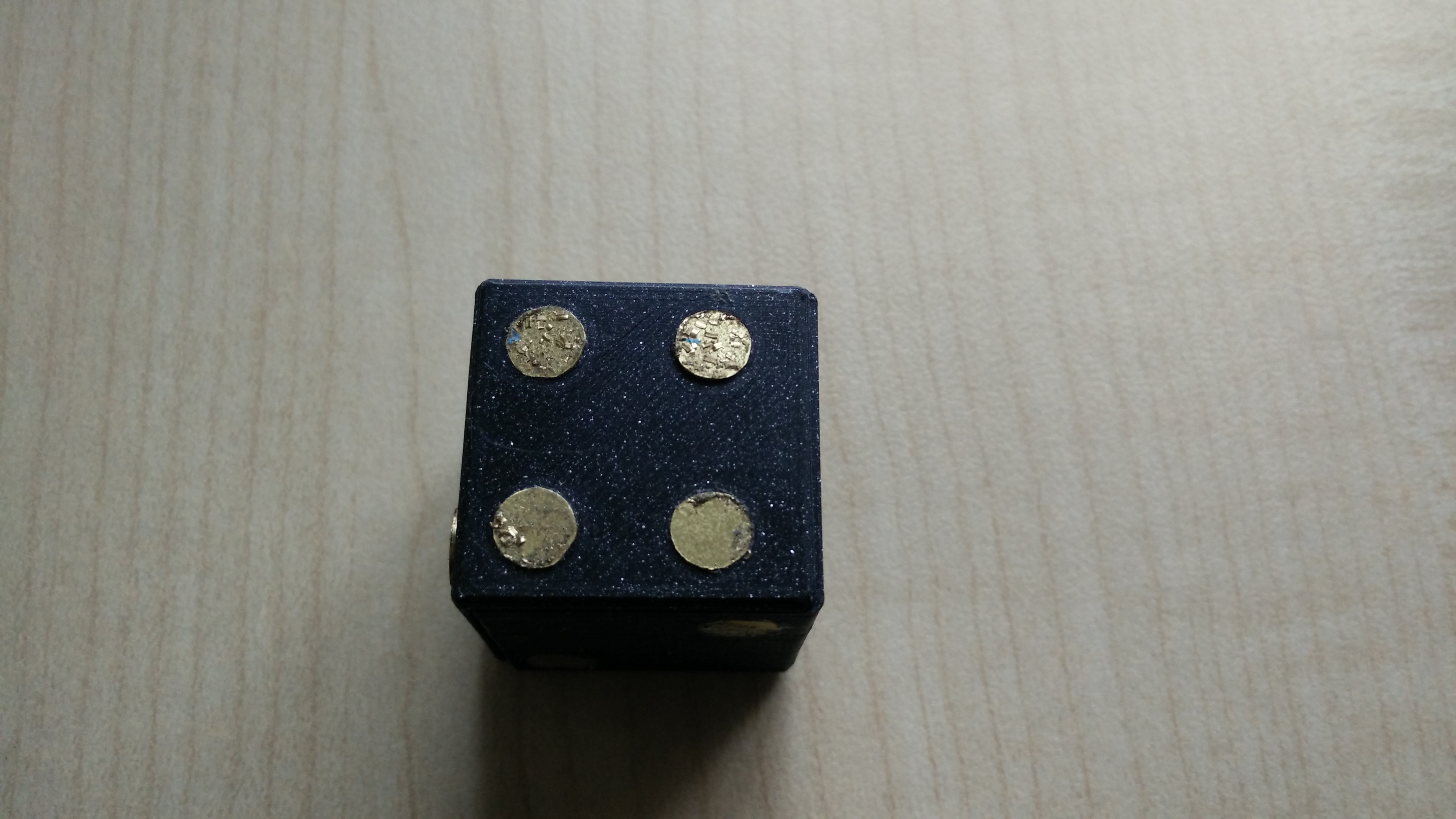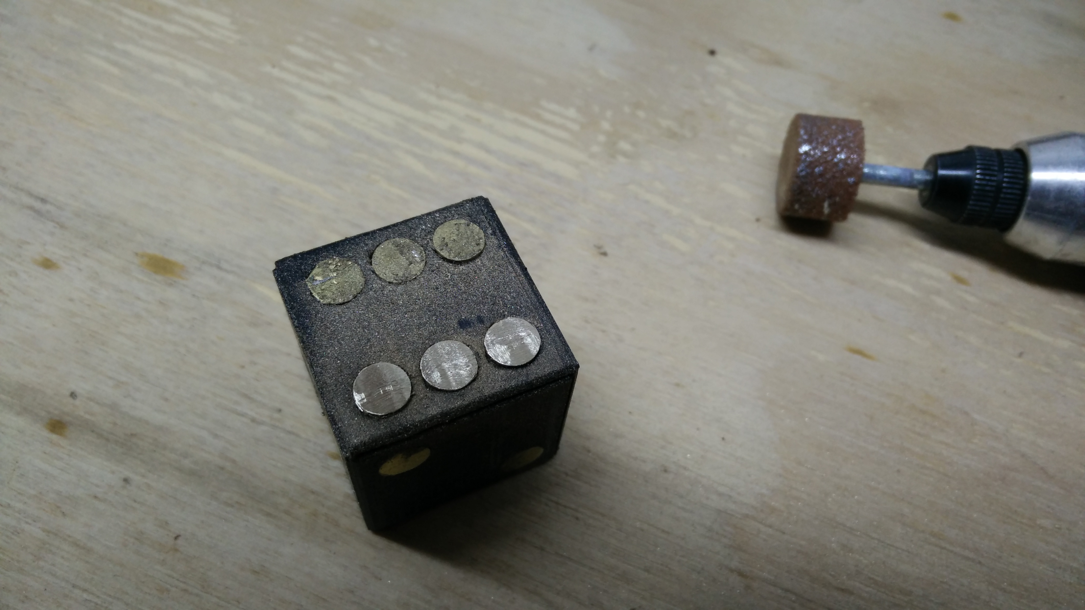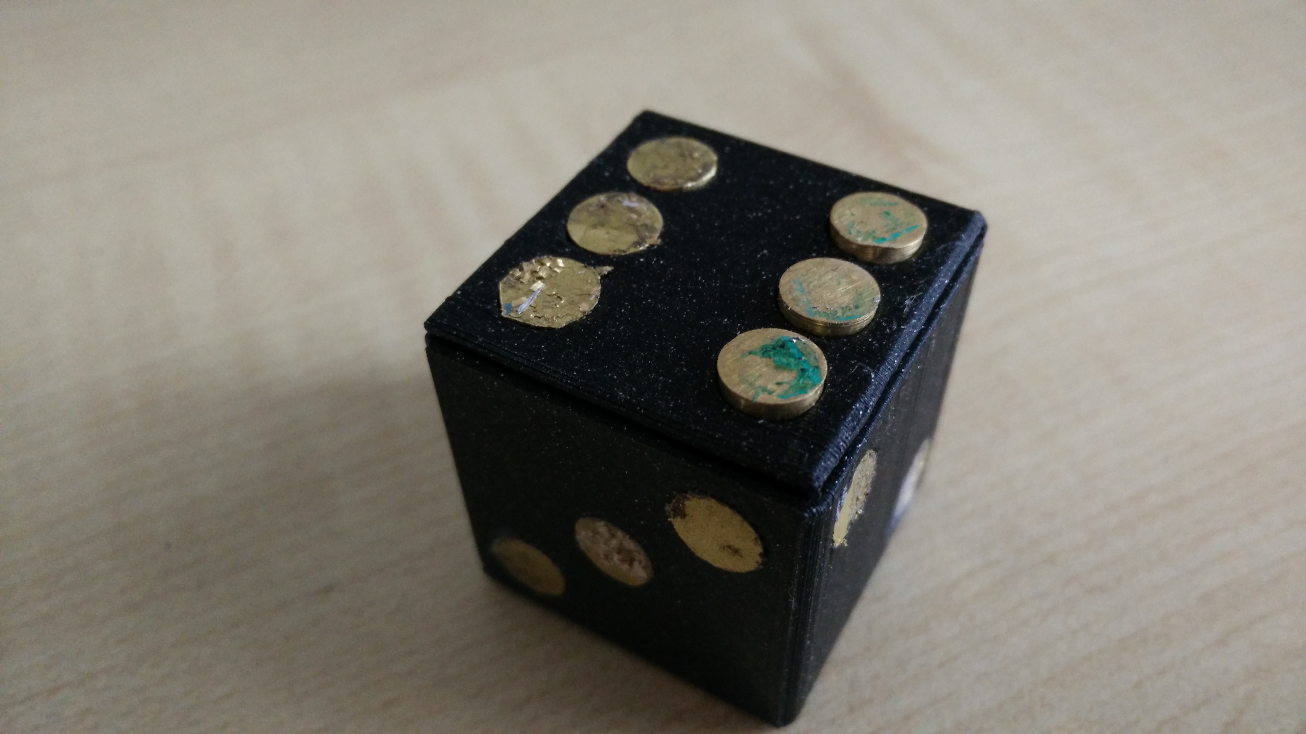 A few months ago, Ruari had the idea of making a hollow die with a magnet under each face and a ball bearing inside. Using a larger magnet external to the die, you would attract the ball bearing to whichever face you wanted to be heaviest, and therefore make an adjustable loaded die. I did some experiments with that idea but I couldn't get an external magnet to be strong enough to move the ball around, and I couldn't stop the ball from moving around on its own when shaken.