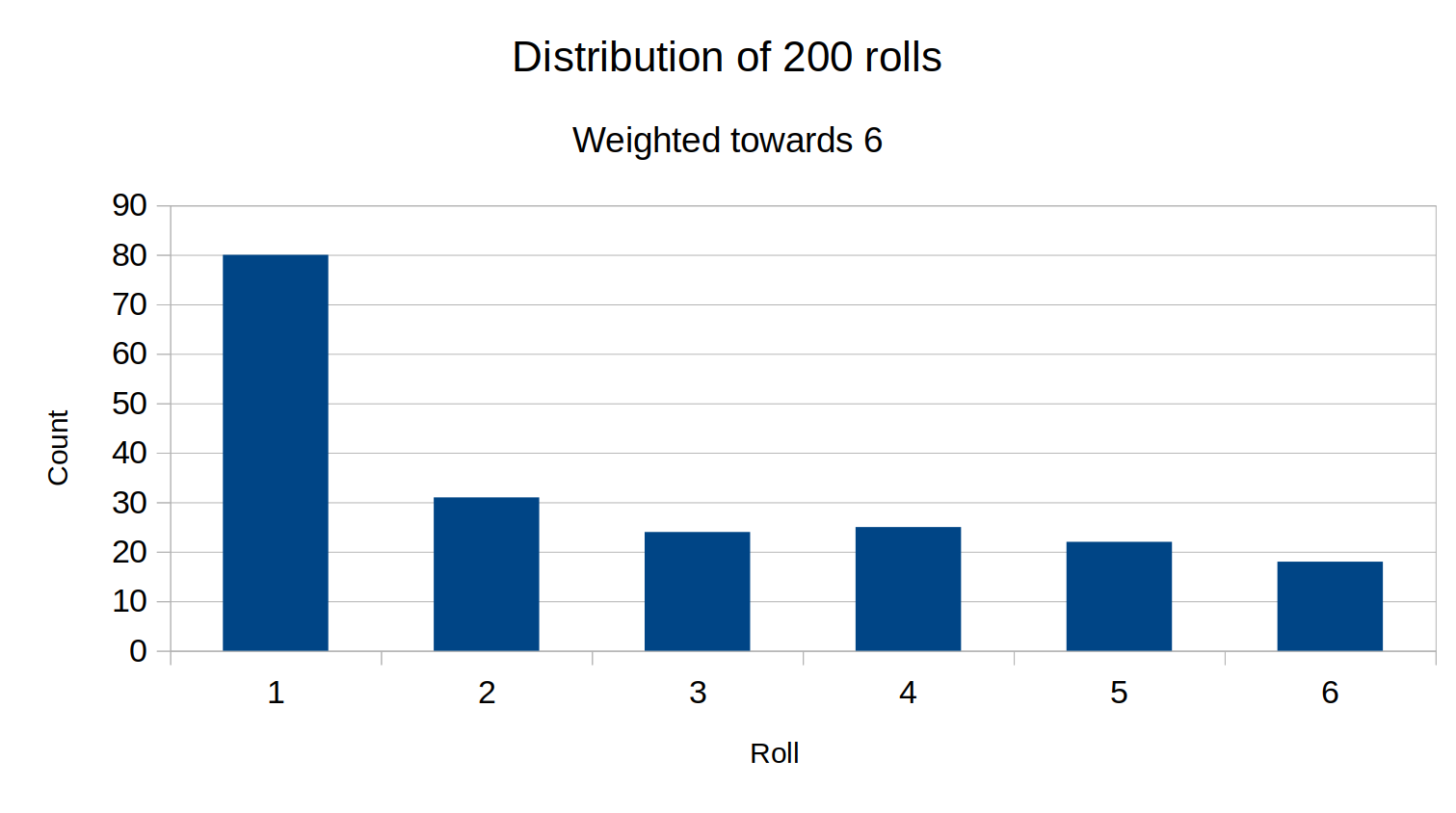 I rolled the die 200 times in each configuration to see how much bias the weight gives the die.