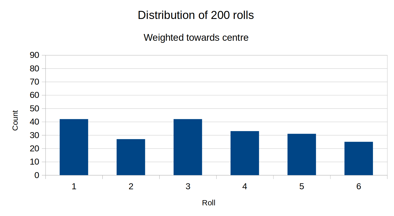 And there is a slight bias towards the 1, I think because the range on the servo is not quite enough to drive the weight far enough away from the 6. Probably this would be improved by making the die slightly smaller so that the range of the servo is a larger proportion of the size of the die.
