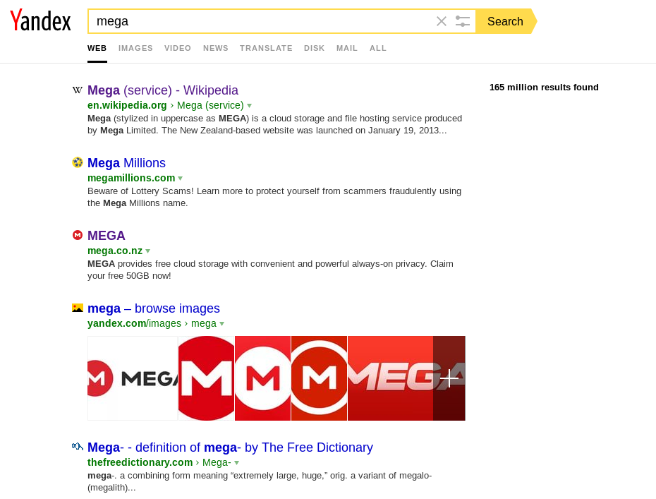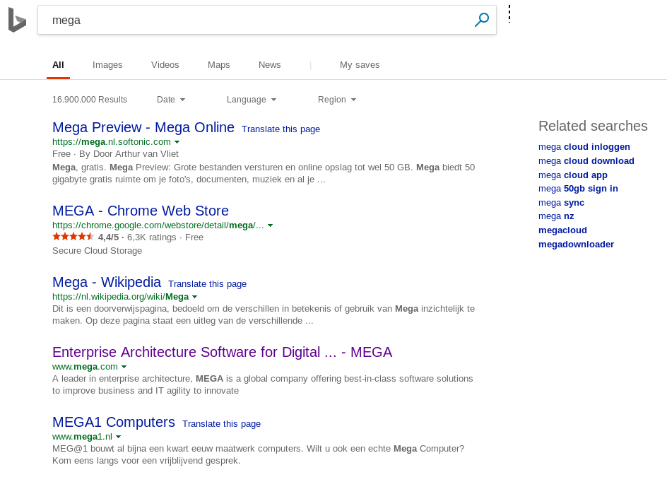 None of them actually came up with the Mega website! Google has a link to the Wikipedia article on Mega, and all except Ask.com have tangentially-related links like the Android app and the Chrome extension. But none of them link to the actual website.
