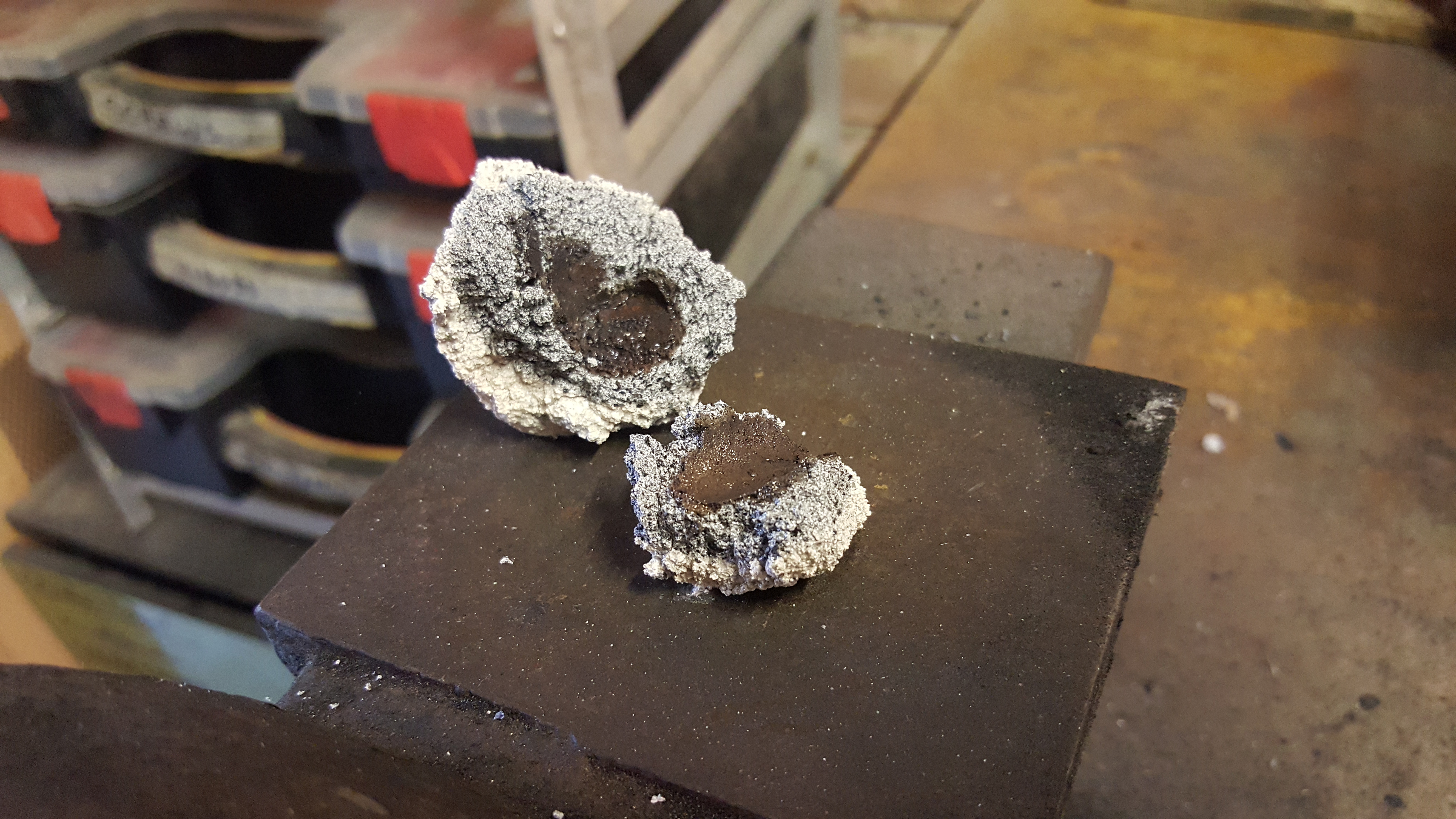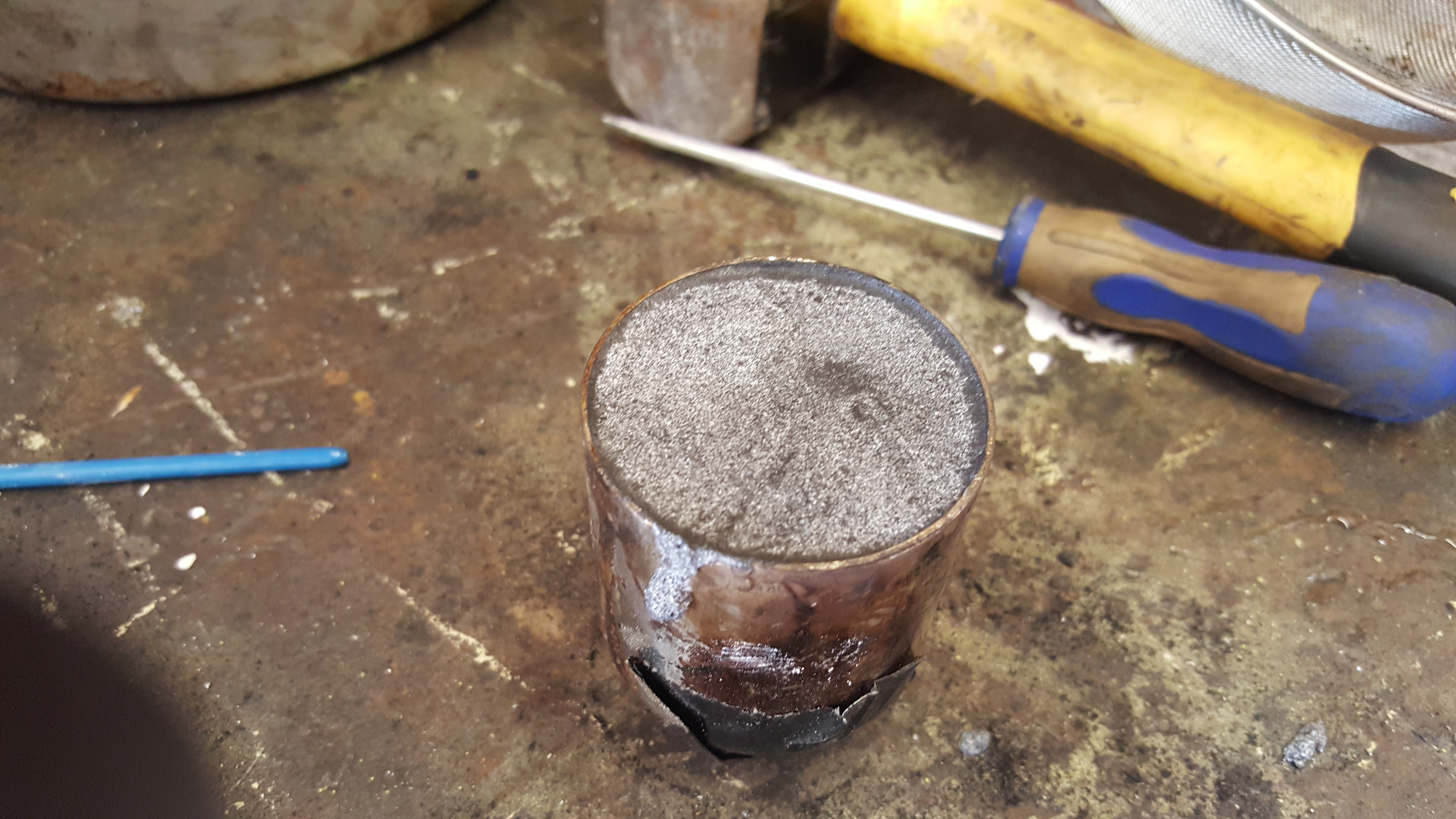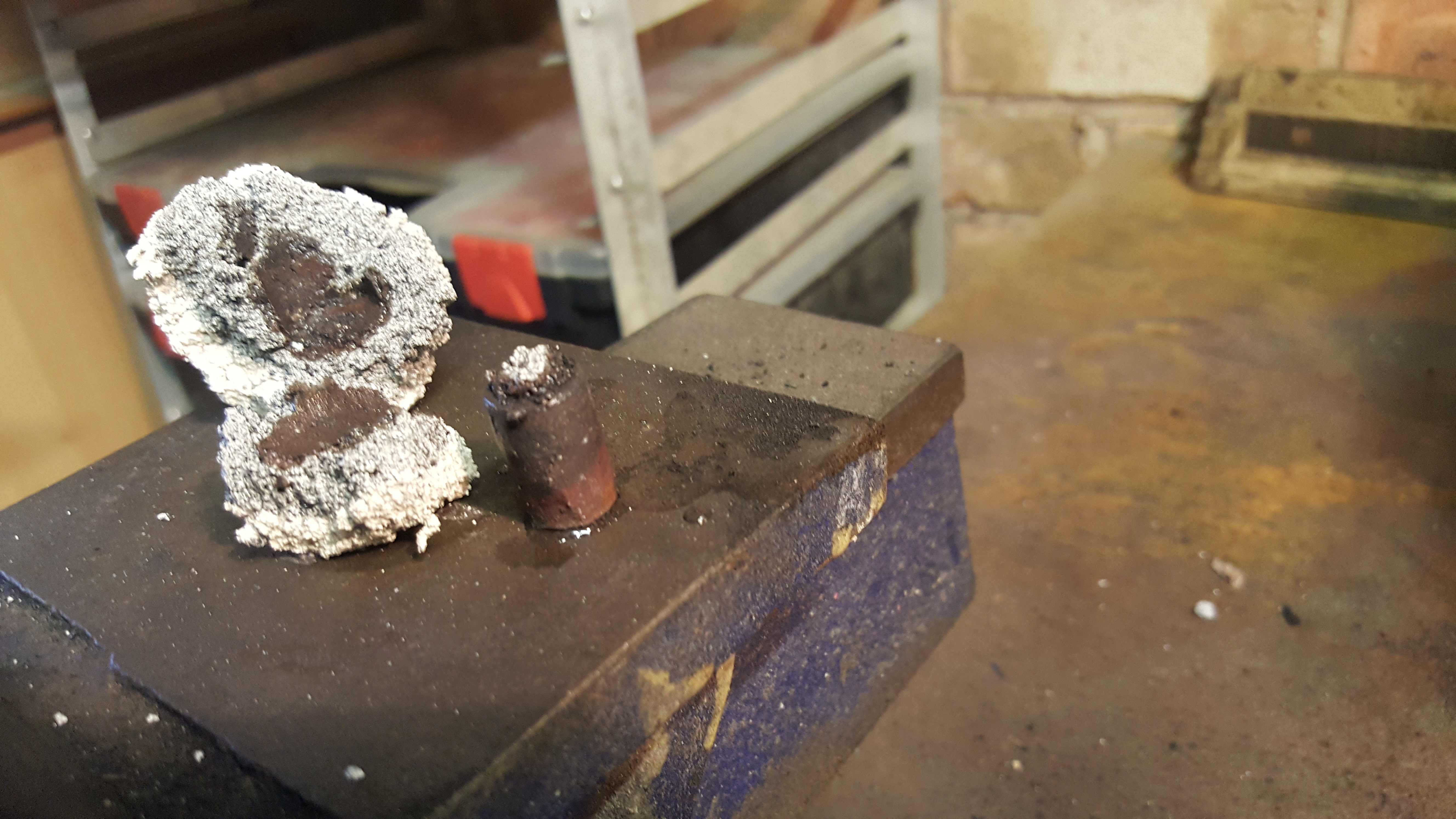 So that tells us that the metal is actually sintered together (else it would just crumble), which is a great result, but for some reason it isn't very strong. I cleaned more of the charcoal plaster remnants off, and sanded the end to see what it looked like: