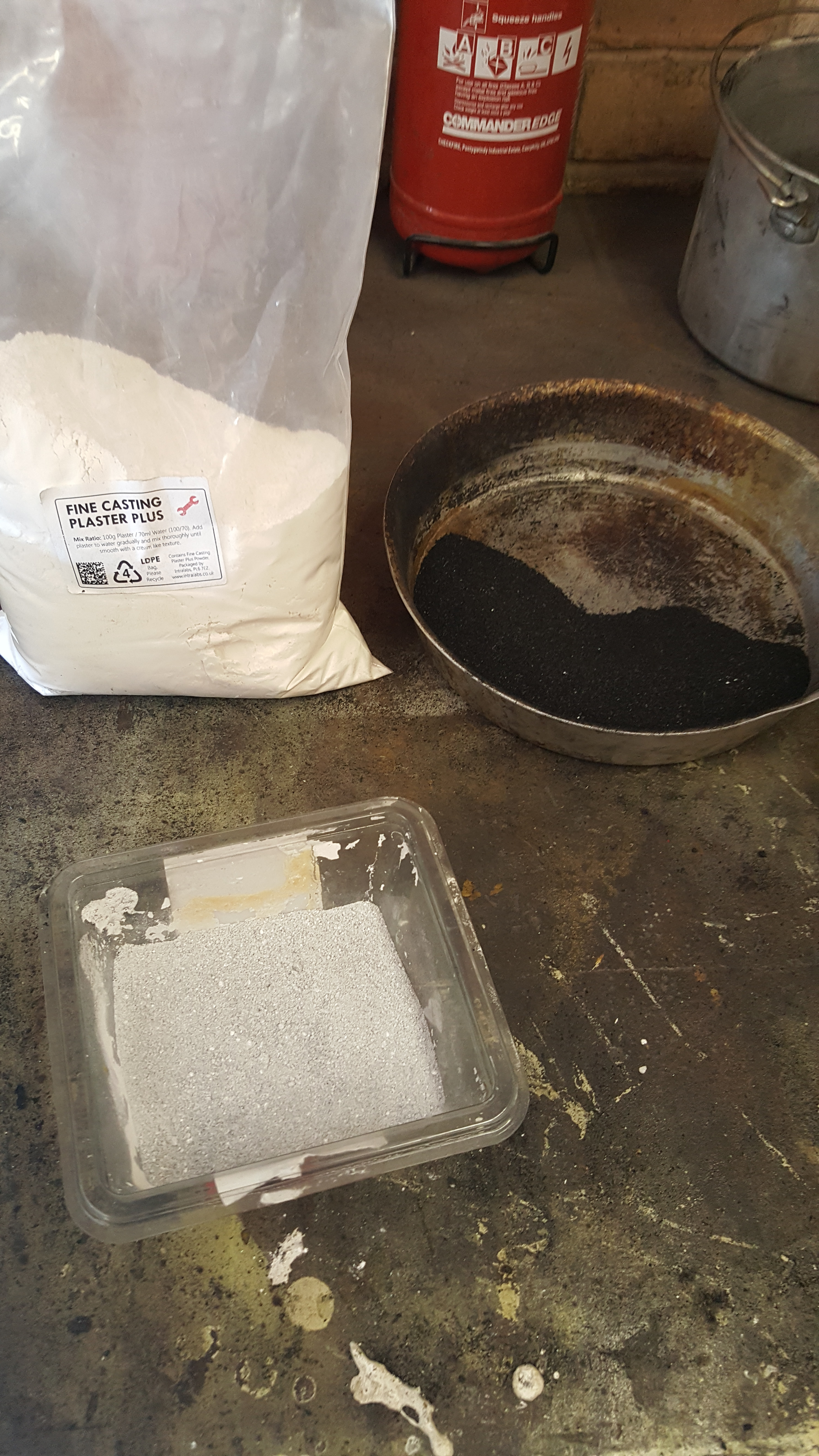 With that in mind, I surmised that a mixture of "fine casting plaster" and charcoal powder would do the job. Casting plaster sets solid when mixed with water, and is porous to gases, and charcoal burns when exposed to oxygen and heat, and turns white after burning, so what could go wrong? So I smashed up a bunch of charcoal, seived out the powder, and mixed it with my plaster roughly 50:50 by weight: