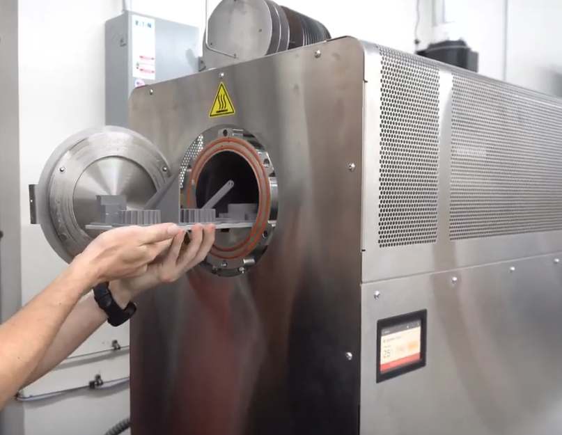 I suspect it is quite important that the chamber is heated uniformly to prevent the part from warping as it shrinks, but if we could produce even a warped 3d printed metal part, that would be a very good starting point. You'll also notice some o-rings around the door of the chamber, and the operator screws the door on before the heating starts. This implies that the furnace needs to be air-tight, possibly it is under vacuum to prevent the metal from oxidising.