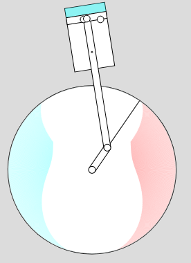 The diagram of the engine includes a representation of the air inside the cylinder, with the colour representing its pressure. The colours drawn on the flywheel indicate the port timing (red means the inlet port is open, blue means the exhaust port is open, and a fatter band means it's open wider).