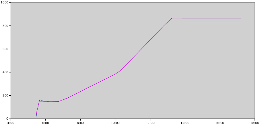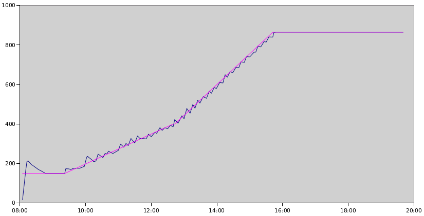 (Again, sorry, no axis labels. Gnumeric makes this hard. X is time, Y is temperature in °C, pink line is desired temperature, blue line is measured temperature).