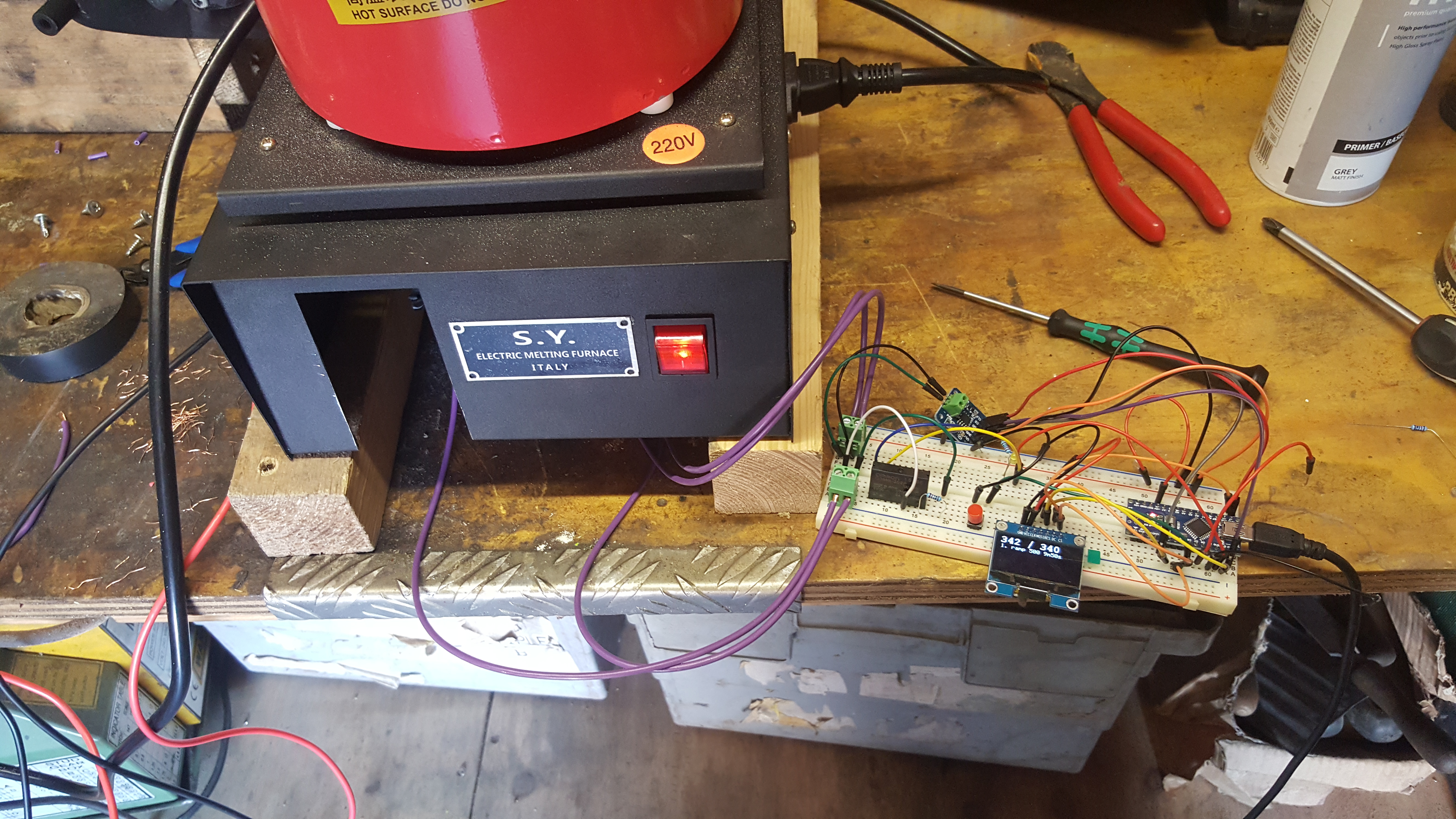 A new CAL 9500 is over £200, which I'm not interested in spending. The seller of the secondhand one said they'd send me another, but they still haven't. So my next idea was to build my own process controller using an Arduino Nano. I used 4 buttons instead of 3 so that "chording" wouldn't be necessary, and I used an OLED screen instead of 7-segment displays so that the screen can display enough text to make the interface understandable. Then I used a MAX31855 breakout board to interpret the signal from the thermocouple, and a solid-state relay to switch the furnace relay on and off.